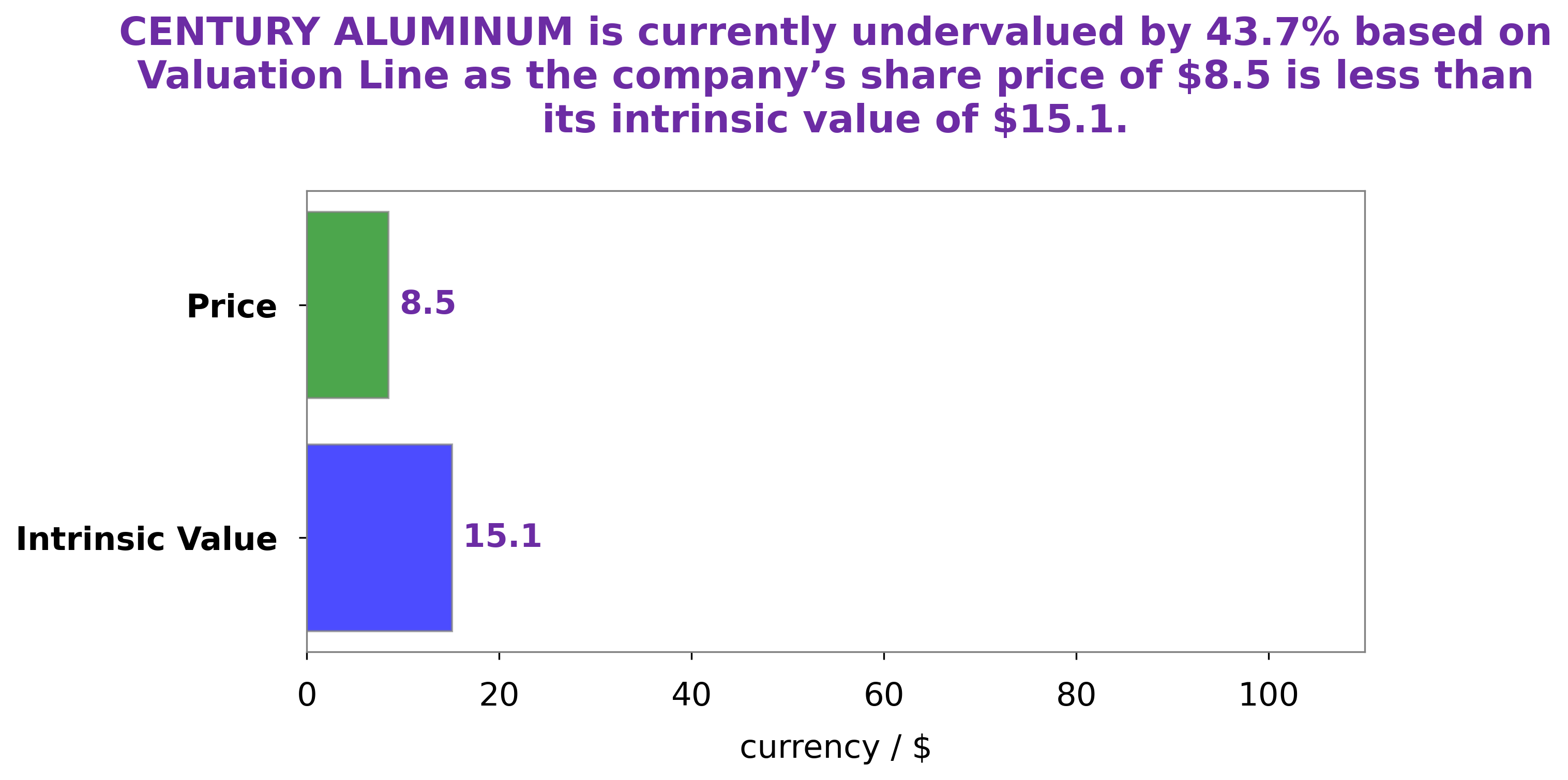 GoodWhale has conducted an in-depth analysis of CENTURY ALUMINUM‘s wellbeing. Through our proprietary Valuation Line, we have determined that the intrinsic value of CENTURY ALUMINUM’s share is around $15.1. This means that the current price, which is trading at $8.5, is undervalued by 43.6%. We believe this presents a great opportunity for investors to capitalize on the potentially profitable trading opportunity. More…