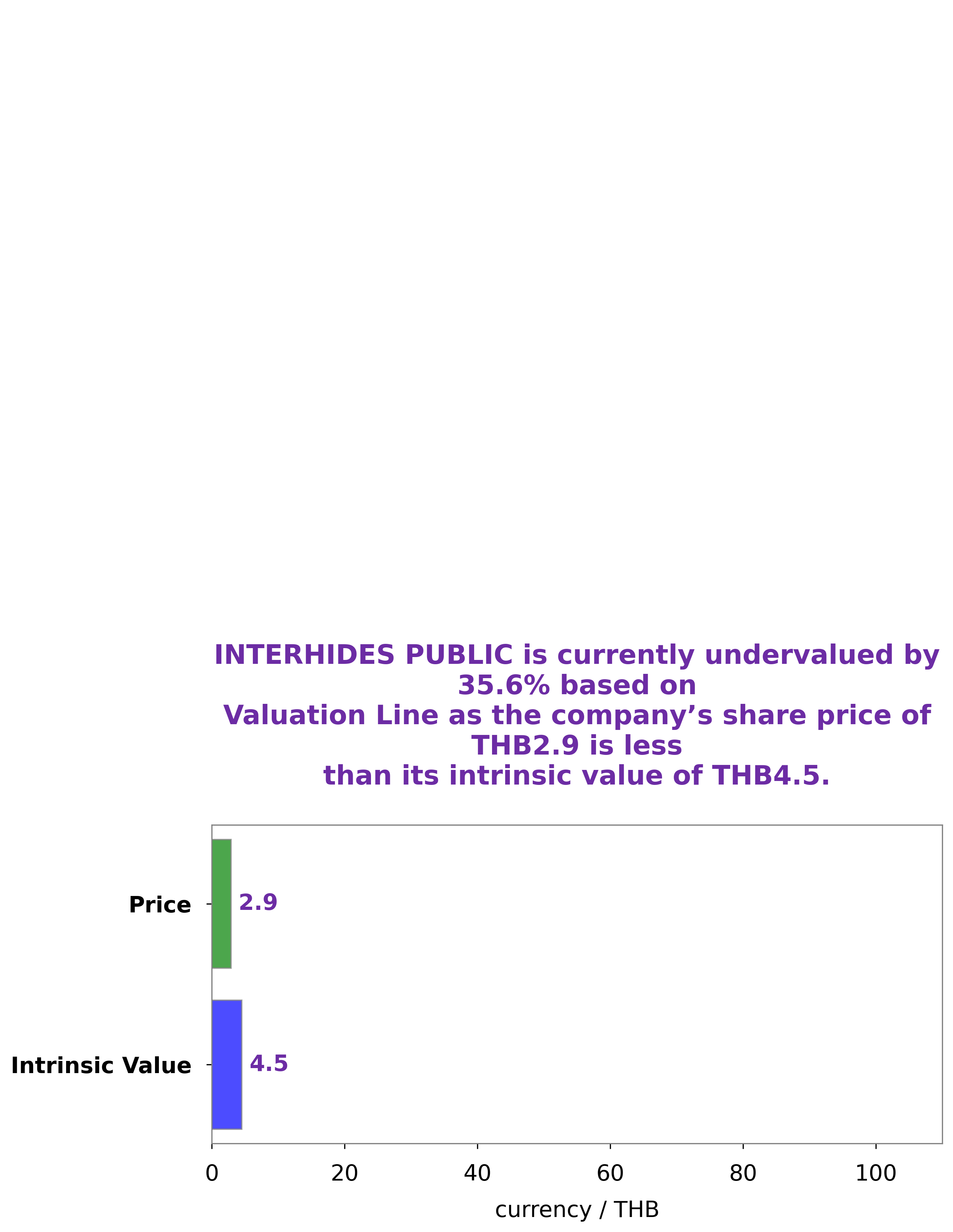 At GoodWhale, we have analyzed the financials of INTERHIDES PUBLIC and calculated the intrinsic value of its share to be around THB4.5. Our proprietary Valuation Line tool was used to make this calculation. After the analysis, it was discovered that the INTERHIDES PUBLIC stock is currently traded at THB2.9, which is a 35.4% undervaluation compared to its intrinsic value. More…