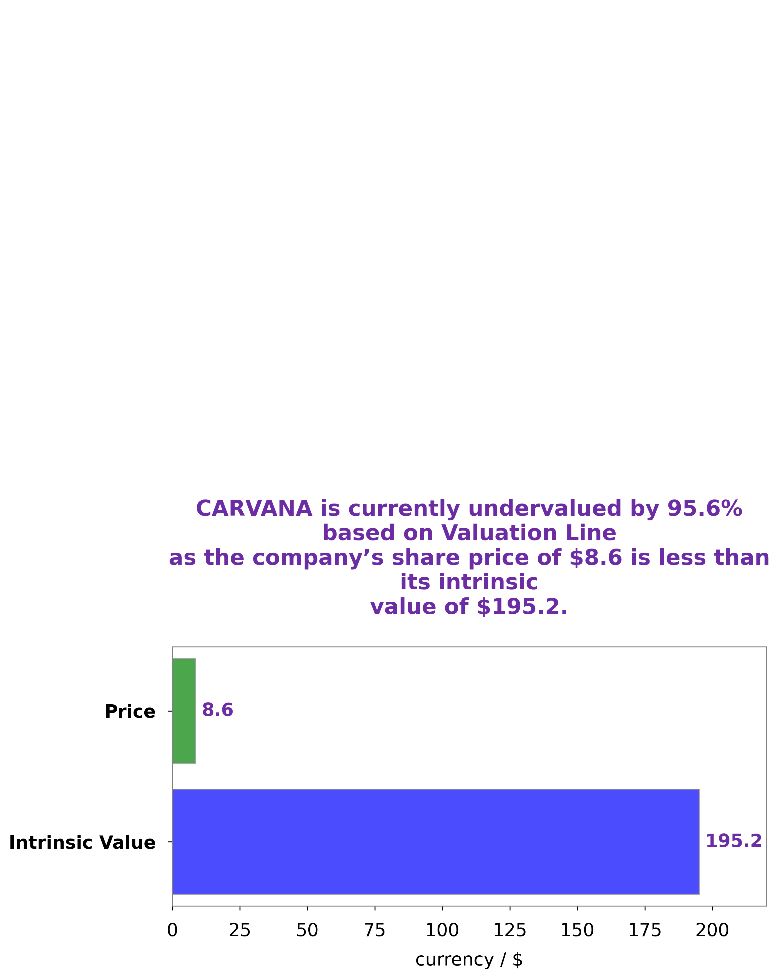 At GoodWhale, we have conducted an analysis of CARVANA‘s wellbeing and have come to the conclusion that the fair value of a CARVANA share is approximately $195.2. This calculation was made using our proprietary Valuation Line Tool. We believe that CARVANA is currently undervalued by a staggering 95.6%, as their current stock is being traded at just $8.6. This presents a great opportunity for investors who are willing to invest in a potentially undervalued company. More…