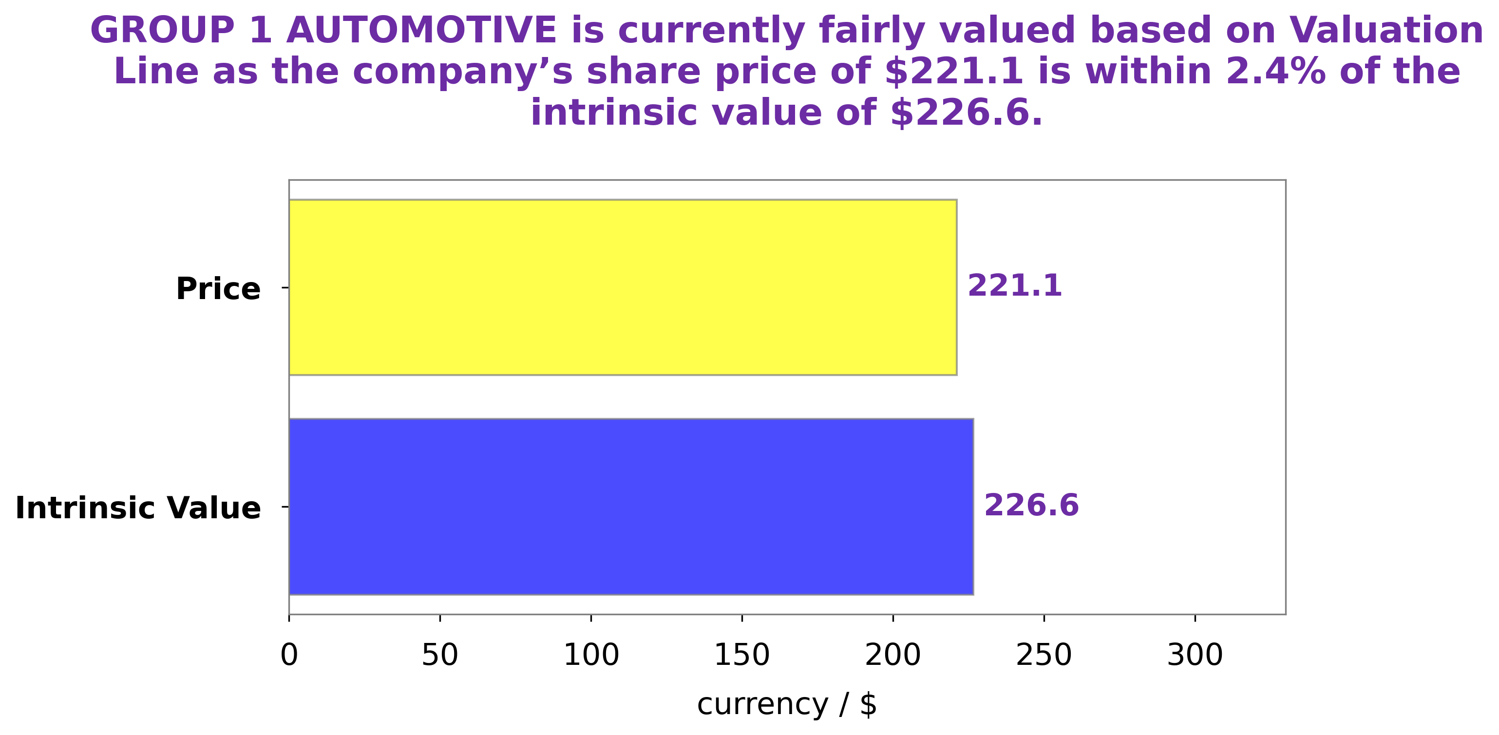 At GoodWhale, we performed a detailed analysis on the financials of GROUP 1 AUTOMOTIVE. Our proprietary Valuation Line determined the fair value of their share to be around $226.6. Currently, GROUP 1 AUTOMOTIVE stock is trading at $221.1, which is slightly undervalued by 2.4%. This presents an opportunity for investors to purchase the stock for a small discount, while still achieving market value in the long run. With our analysis, investors can make informed decisions when it comes to their investments. More…