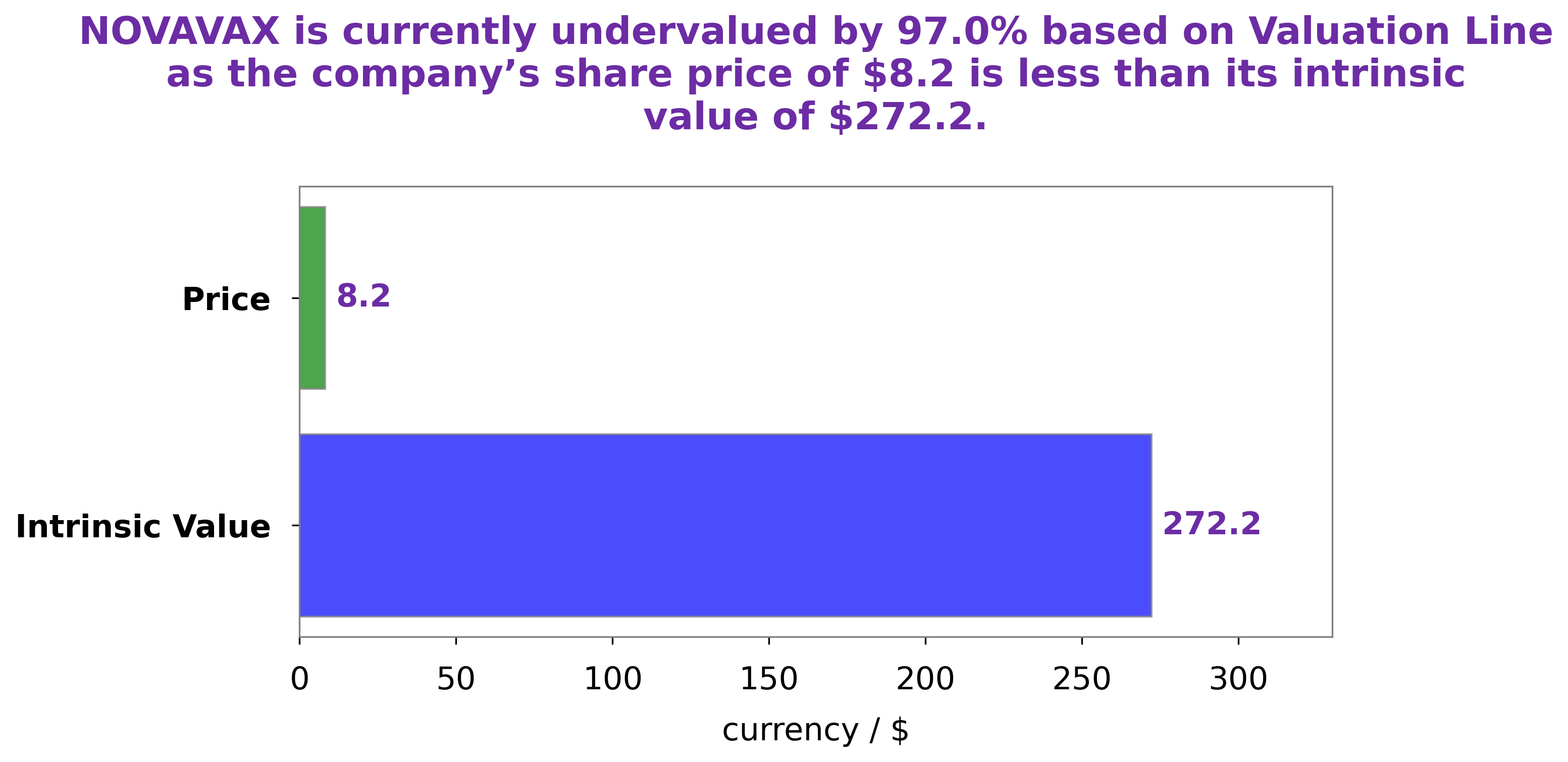 GoodWhale has conducted an analysis of NOVAVAX‘s wellbeing and, based on our proprietary Valuation Line, have concluded that the intrinsic value of the company’s share is approximately $272.2. This suggests that NOVAVAX is currently trading at $8.2, which is a 97.0% discount to its intrinsic value. This indicates that it is significantly undervalued, presenting an excellent opportunity for investors. More…