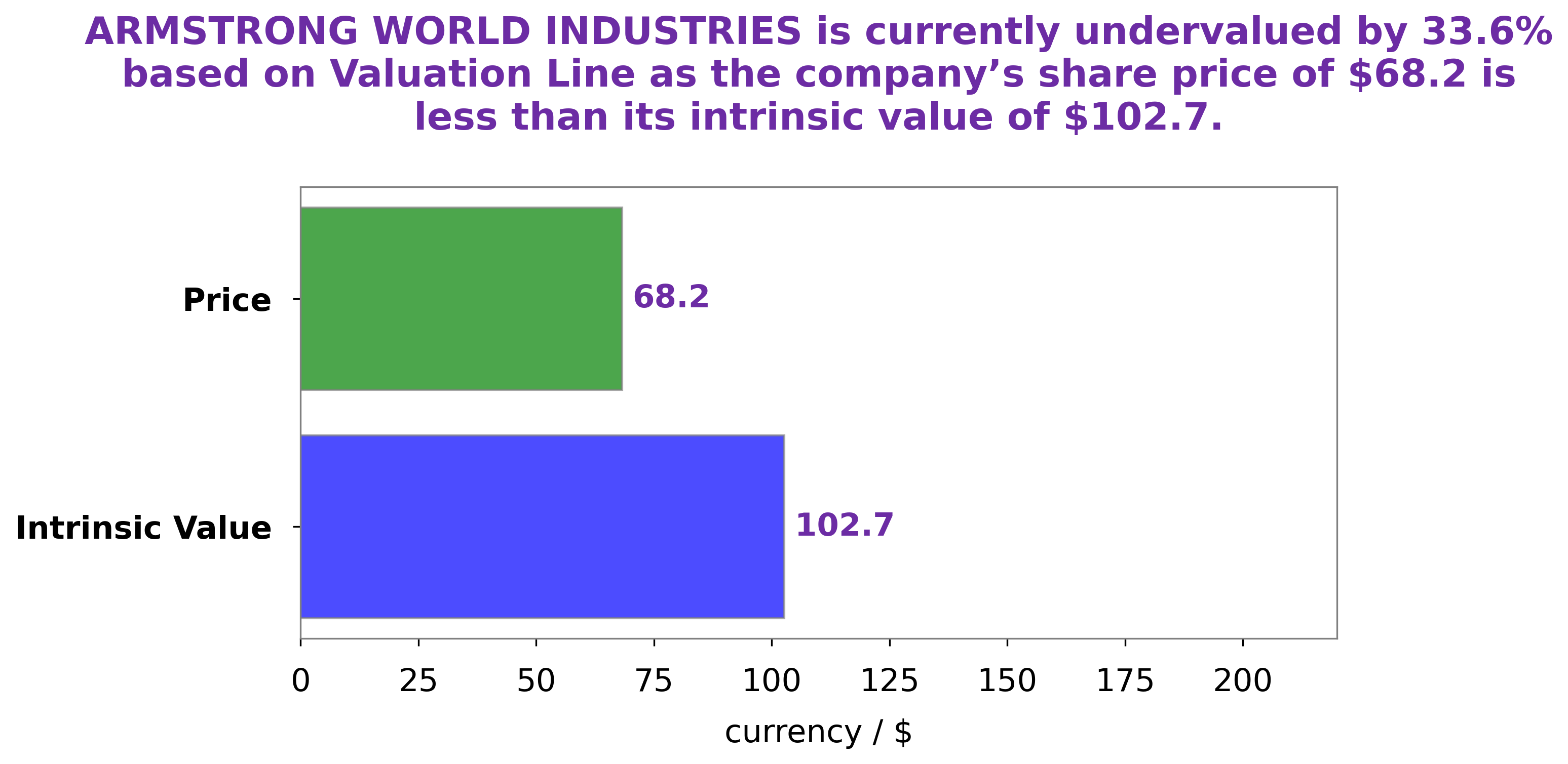 At GoodWhale, we analyze the financials of ARMSTRONG WORLD INDUSTRIES to determine its fair value. By employing our proprietary Valuation Line, we have calculated that ARMSTRONG WORLD INDUSTRIES share is around $102.7. This implies that its current price of $68.2 is undervalued by 33.6%. We at GoodWhale recommend investors to make informed decisions about their investments based on our analysis, and to take advantage of this potential undervaluation. More…