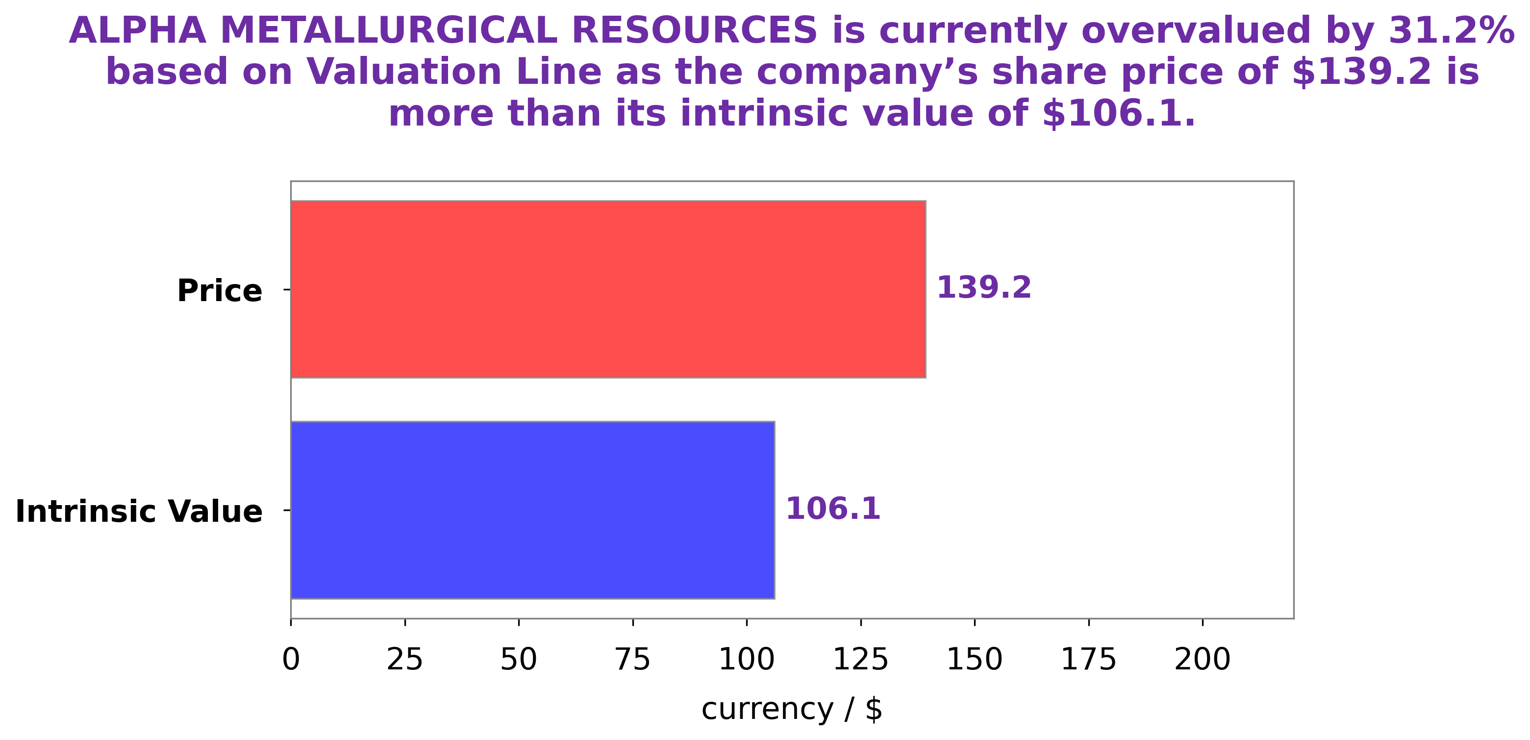 Analyzing the fundamentals of ALPHA METALLURGICAL RESOURCES can be easy with GoodWhale. Our proprietary Valuation Line has calculated the intrinsic value of ALPHA METALLURGICAL RESOURCES shares to be around $106.1. Currently, ALPHA METALLURGICAL RESOURCES stock is traded at $139.2, which is 31.2% overvalued compared to the intrinsic value. More…