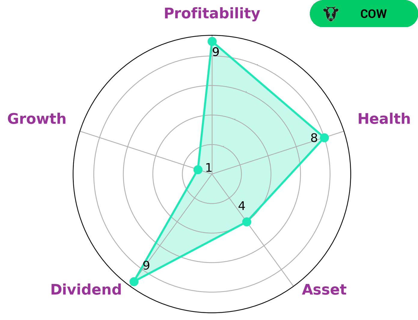 VI app simplifies the analysis of CISCO SYSTEMS‘ long term potential by providing insight into the company’s fundamentals. According to the VI Star Chart, the company is strong in dividend, profitability, and medium in asset while weak in growth. Moreover, CISCO SYSTEMS has a high health score of 8/10, indicating its capability to sustain future operations during times of crisis due to its cashflows and debt. CISCO SYSTEMS is classified as a ‘cow’, a type of company that has a track record of paying out consistent and sustainable dividends. This makes it an attractive investment prospect for investors that prioritize safety and stability, such as retirees and those with low risk tolerance. Those looking for high returns may be disappointed as the company’s growth is below average. Overall, CISCO SYSTEMS is a safe and reliable investment option with a good track record of dividend payments. Investors looking for a secure and reliable source of income may find it an attractive option. However, those seeking high returns may want to look elsewhere as the company’s growth is below average. More…