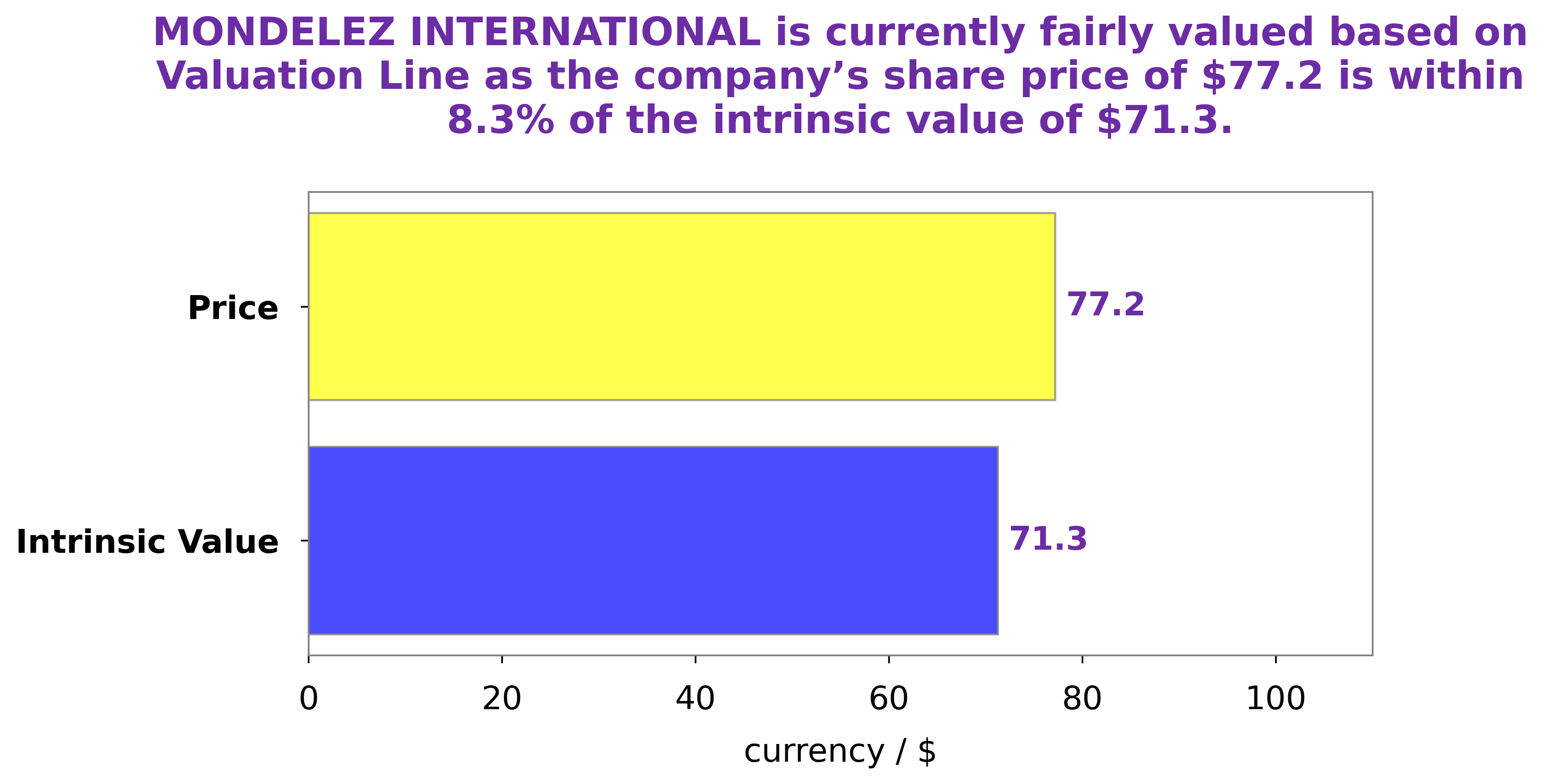 At GoodWhale, we have conducted a thorough analysis of MONDELEZ INTERNATIONAL‘s financials to determine its intrinsic value. Our proprietary Valuation Line has calculated the intrinsic value of a MONDELEZ INTERNATIONAL share to be around $71.3. Currently, MONDELEZ INTERNATIONAL stock is traded at $77.2, which is a fair price, although slightly overvalued by 8.3%. We recommend investors to carefully consider the stock and the potential risks associated before investing. More…