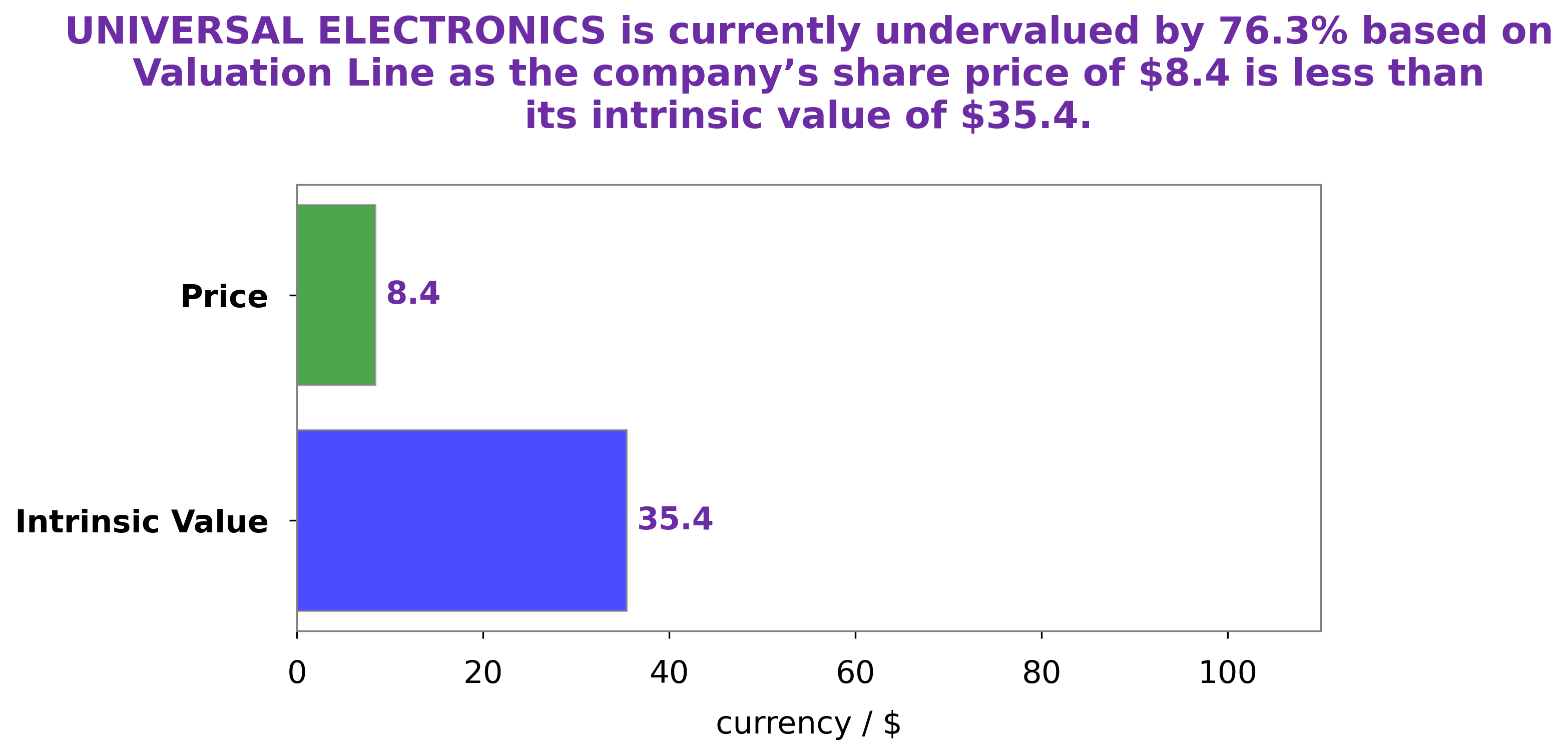 We at GoodWhale have conducted an analysis of UNIVERSAL ELECTRONICS‘s fundamentals. Our proprietary Valuation Line has calculated the intrinsic value of UNIVERSAL ELECTRONICS share to be around $35.4. However, the current market price of the stock is only $8.4, which means that UNIVERSAL ELECTRONICS is currently undervalued by 76.3%. More…