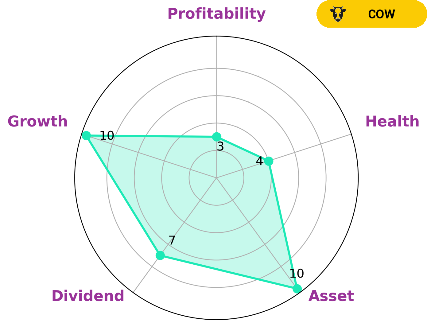 Ready Capital Corporation is classified as a ‘cow’ based on the VI Star Chart, which means it has a track record of paying out consistent and sustainable dividends. This makes it an attractive option for investors seeking a steady source of income, such as retirees and those looking to diversify their portfolios. Ready Capital also has an intermediate health score of 4/10 when it comes to its cashflows and debt, indicating that it is likely to be able to sustain future operations even in the event of a crisis. In terms of its fundamentals, Ready Capital is strong in asset, dividend, and growth, but weak in profitability. The company’s balance sheet reveals that it has a substantial amount of cash on hand and relatively low levels of debt, which is reassuring for potential investors. Additionally, the stock has had a steady increase in its dividend payouts over the years, making it an attractive option for dividend-seeking investors. Overall, Ready Capital Corporation is a company with a solid track record of dividends and a good balance sheet. This makes it a good option for investors looking for steady income with a low risk profile. The company’s fundamentals and performance suggest that it has the potential to be a long-term investment for those seeking consistent returns. More…