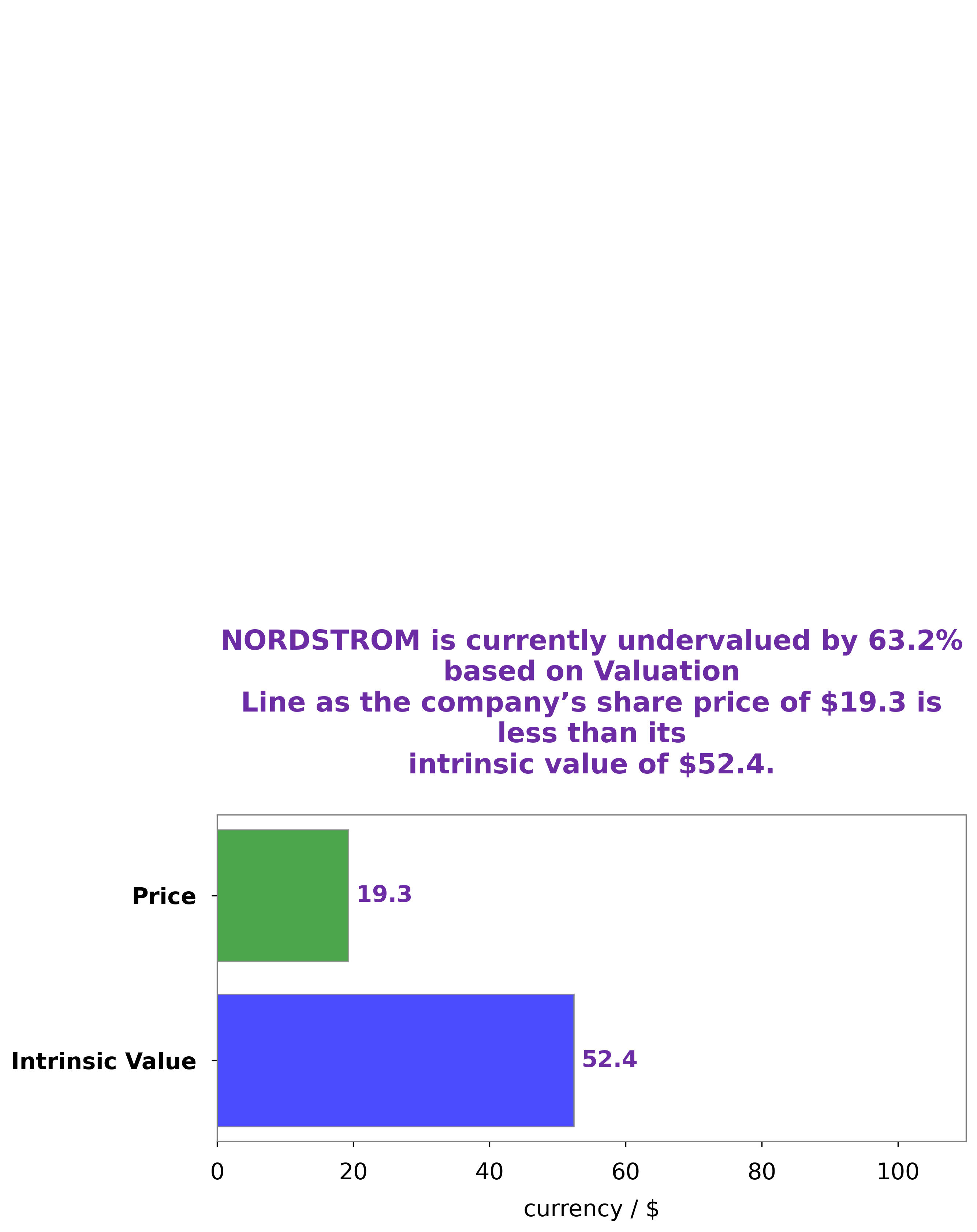We at GoodWhale conducted an analysis of NORDSTROM‘s wellbeing, and our proprietary Valuation Line revealed that the intrinsic value of NORDSTROM shares is around $52.4. However, currently, the stock is trading at $19.3, which is undervalued by a whopping 63.2%. We believe this presents an attractive opportunity for investors looking to capitalize on the stock’s potential as it is trading well below its intrinsic value. More…