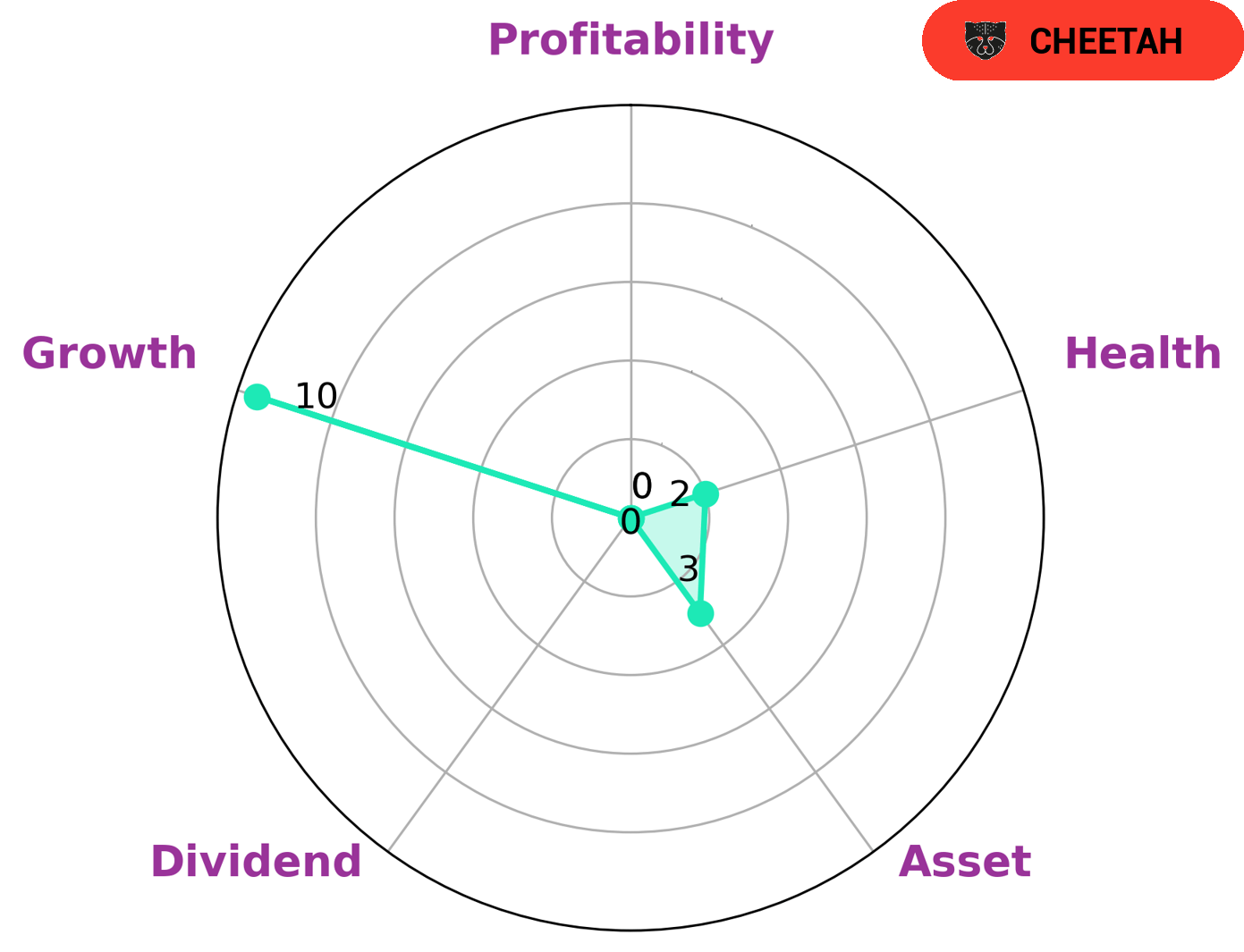 As a part of our analysis of VOLITIONRX LIMITED‘s financials, GoodWhale generated a Star Chart to assess its strengths and weaknesses. We concluded that the company is strong in terms of growth, but weak in asset, dividend and profitability. Additionally, our Health Score for VOLITIONRX LIMITED was 2/10, indicating that it is less likely to pay off debt and fund future operations. Based on these findings, we classified VOLITIONRX LIMITED as a ‘cheetah’ type of company. This means that it has achieved high revenue or earnings growth but is considered less stable due to lower profitability. Investors interested in such a company may be looking to capitalize on short-term gains, as the company lacks long-term stability. More…
