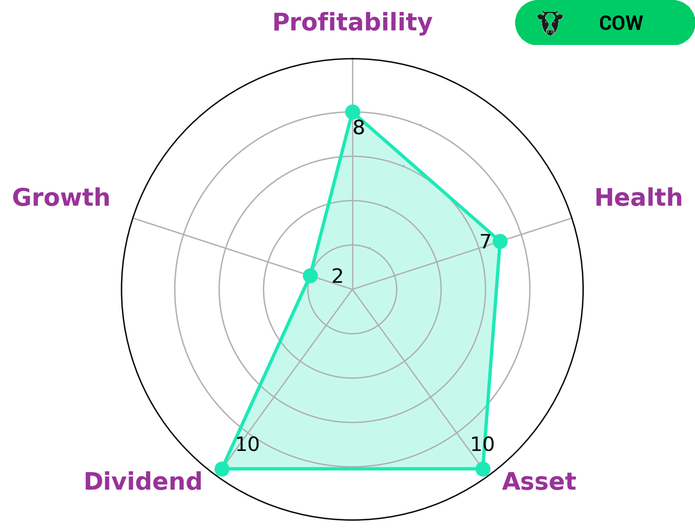 At GoodWhale, we analyze the fundamentals of QUEBECOR INC to help investors make informed decisions. Our Star Chart classifies the company as a ‘cow’, indicating that it has the track record of paying out consistent and sustainable dividends. This type of company is likely to be very attractive to dividend investors, who seek a steady income stream. When it comes to financial health, QUEBECOR INC scores highly, with a health score of 7/10. This suggests that the company is financially sound and capable of riding out any crisis without having to worry about the risk of bankruptcy. Moreover, the company is strong in terms of its assets, dividend payments, and profitability, but weak in terms of growth. All these factors make QUEBECOR INC an attractive choice for investors looking for a reliable and stable investment. More…