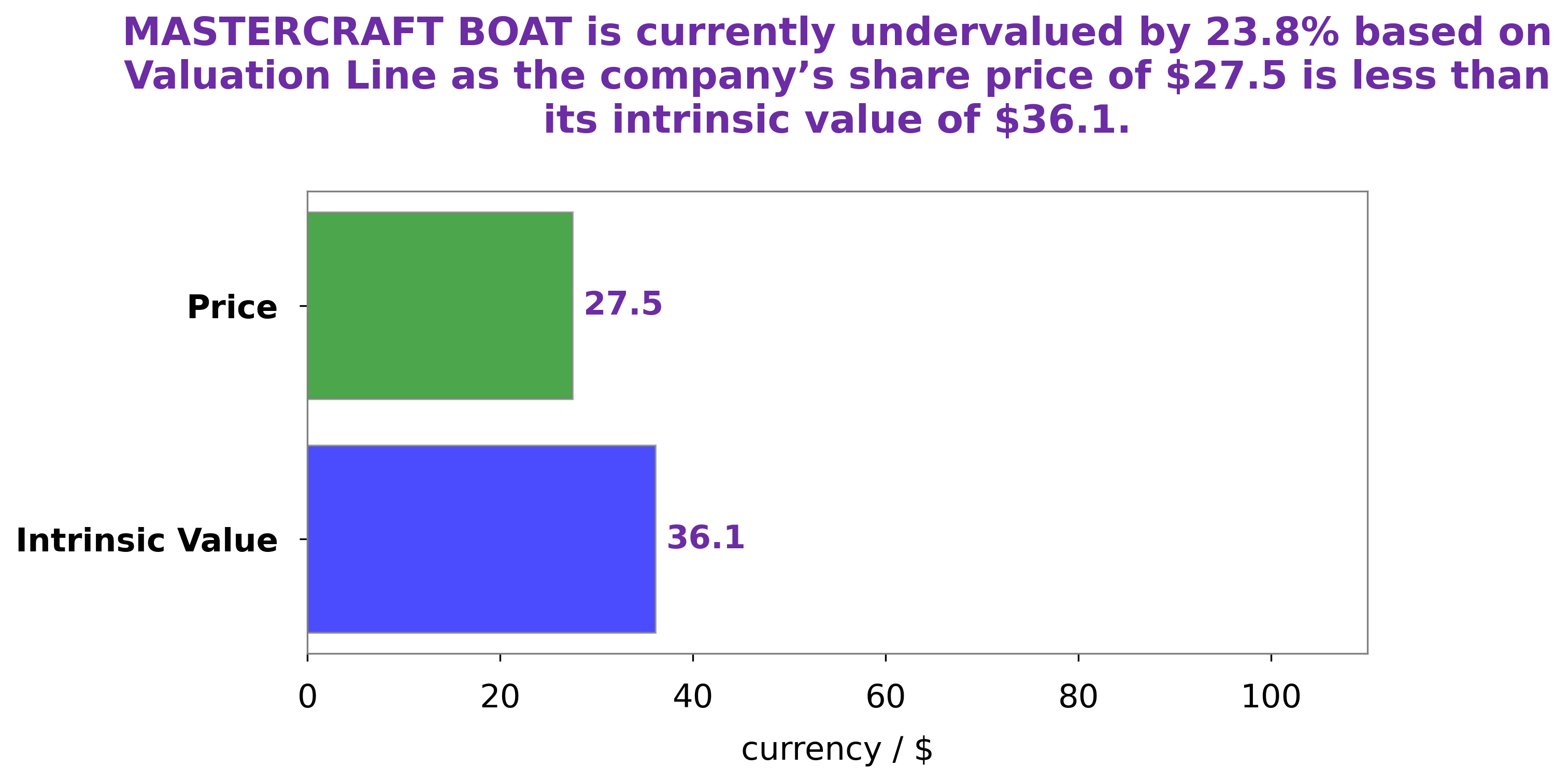 At GoodWhale, we have analyzed the financials of MASTERCRAFT BOAT and believe that the fair value of its share is around $36.1. This valuation was calculated using our proprietary Valuation Line, which looks at a range of factors, including the company’s historical performance and global economic trends. At present, MASTERCRAFT BOAT’s stock is trading at $27.5, which represents an undervaluation of 23.9%. We believe this presents a great opportunity for investors to purchase a quality stock at a discount. More…
