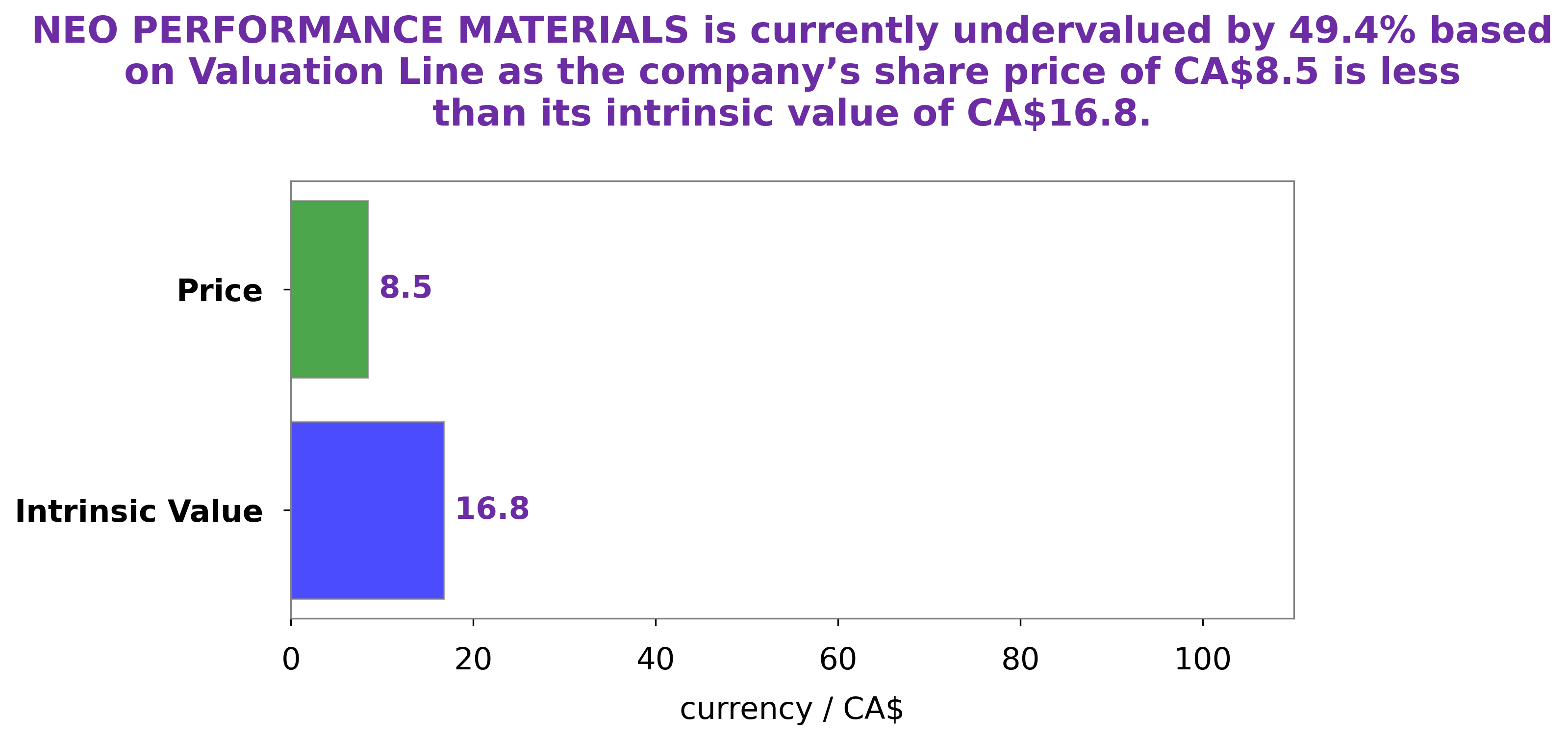 At GoodWhale, we have extensively analyzed the fundamentals of NEO PERFORMANCE MATERIALS. Our proprietary Valuation Line suggests that the intrinsic value of the company’s share is around CA$16.8. However, the current market price of NEO PERFORMANCE MATERIALS stock is CA$8.5, significantly lower than its intrinsic value. This represents a 49.5% undervaluation of the company’s stock, making it an attractive investment opportunity for potential investors. More…
