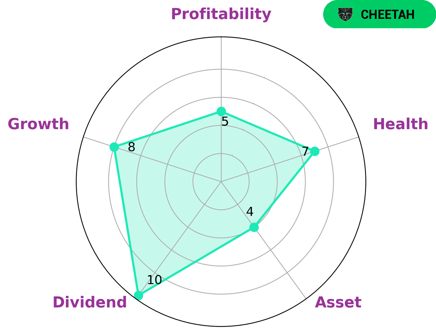 NEXTERA ENERGY PARTNERS is classified as a ‘cheetah’ company based on GoodWhale’s Star Chart analysis. This type of company has achieved high revenue or earnings growth, but is considered to be less stable due to lower profitability. Cheetah companies may be of interest to investors who are looking for potential opportunities for higher returns, but are willing to accept a degree of risk. NEXTERA ENERGY PARTNERS has a strong performance in terms of dividend and growth and a medium performance in terms of assets and profitability. The company has a high health score of 7/10, indicating it has the capacity to sustain operations even in times of crisis. This makes it a good option for investors who are looking for steady returns but are also aware of the risks associated with investing in a cheetah company. Overall, NEXTERA ENERGY PARTNERS is an attractive investment option for those who are willing to take on the risk associated with investing in a cheetah company. The company’s strong dividend, growth, asset and profitability performance, as well as its high health score, make it an attractive option for investors looking for potential opportunities for higher returns. More…