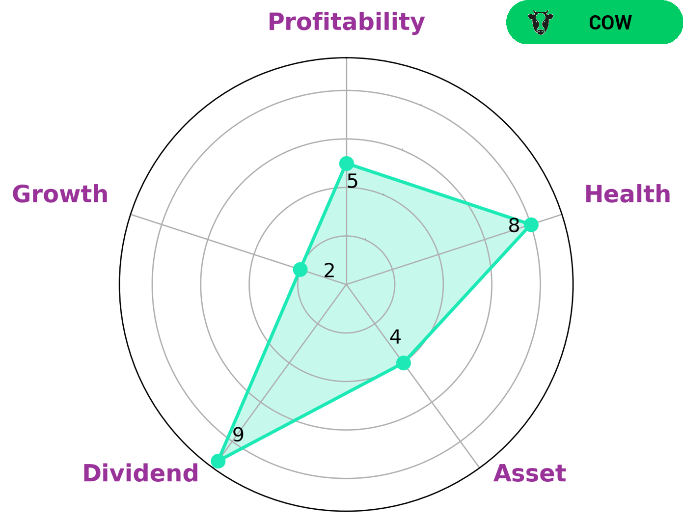 As GoodWhale, we have conducted an analysis of the financial information of NEWMONT CORPORATION. Our star chart shows that NEWMONT CORPORATION is classified as a ‘cow’, which we interpret as a company with a track record of paying out consistent and sustainable dividends. Therefore, this type of business may be attractive to investors who value dividend payments over capital growth. NEWMONT CORPORATION is strong in dividend, but medium in asset, profitability and growth. Despite this, they still have a high health score of 8/10 with regard to their cashflows and debt, indicating that they are capable of sustaining their operations even in times of economic crisis. More…