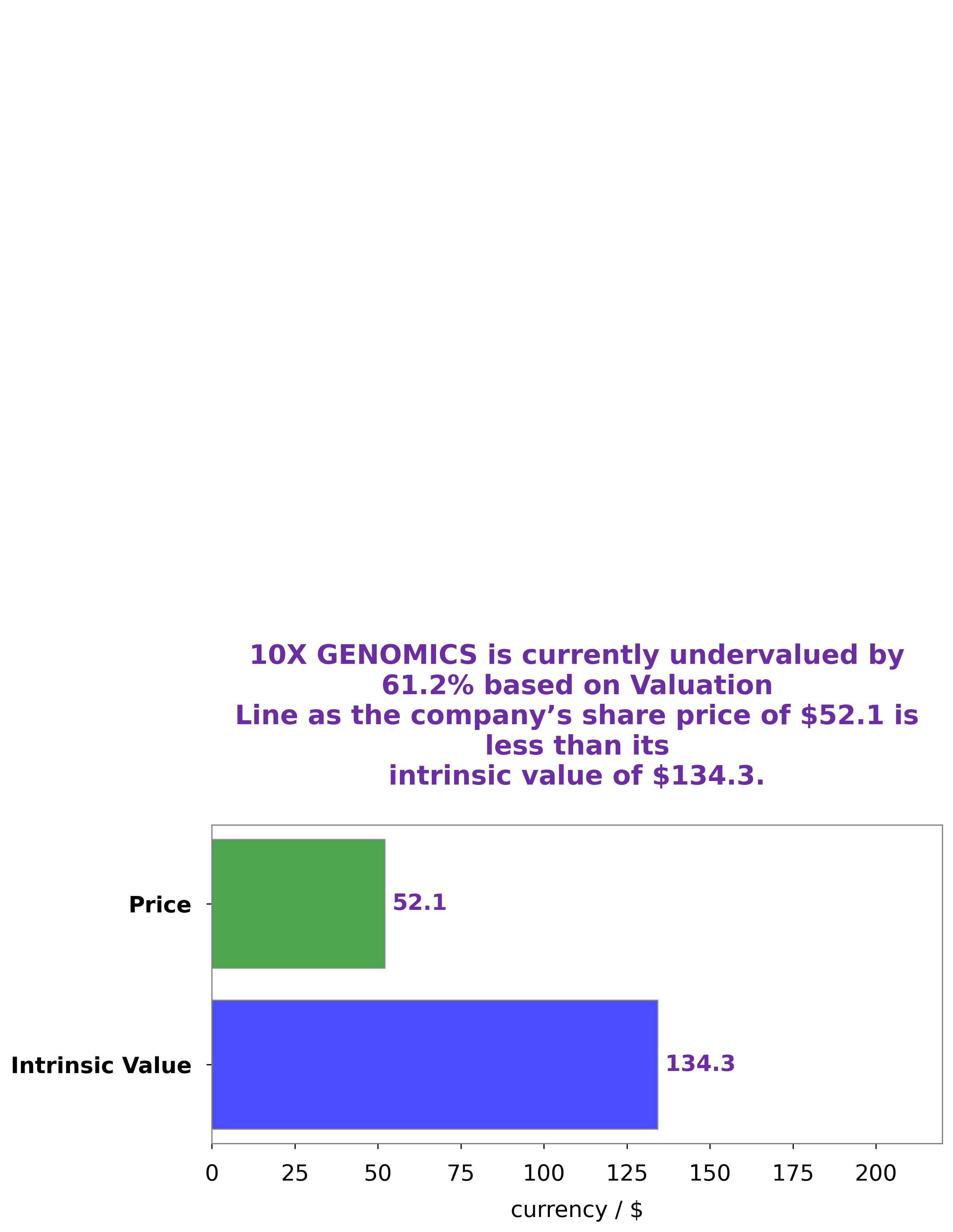 GoodWhale has conducted an analysis of 10X GENOMICS‘s wellbeing. Our proprietary Valuation Line has determined the intrinsic value of 10X GENOMICS share to be around $134.3. However, at present, the 10X GENOMICS stock is being traded at $52.1, which is undervalued by 61.2%. This presents an opportunity for investors to buy the stock at a bargain price, and reap huge rewards when the stock price goes up to its intrinsic value. More…