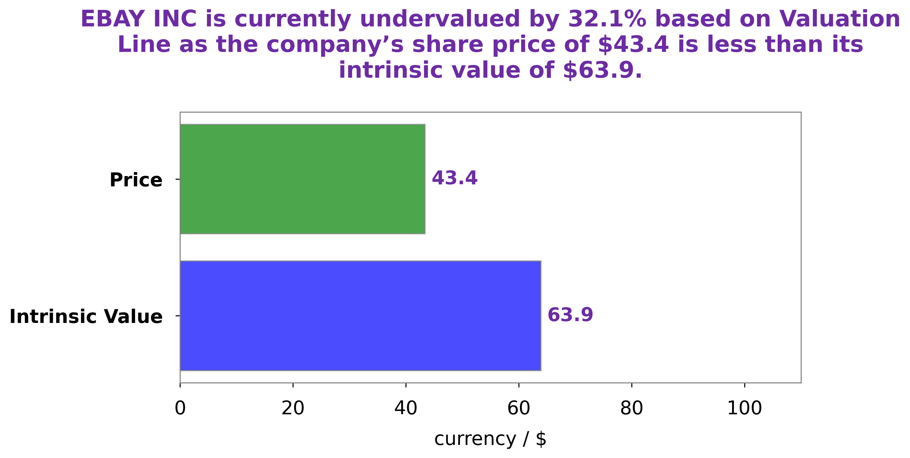 As GoodWhale, we have conducted an analysis of EBAY INC‘s wellbeing. Our proprietary Valuation Line has calculated the intrinsic value of EBAY INC share to be around $63.9. That being said, the current market price of the stock is $43.4, which shows it is undervalued by 32.1%. This implies that EBAY INC’s stock presents a good buying opportunity to investors who are looking for attractive returns. More…