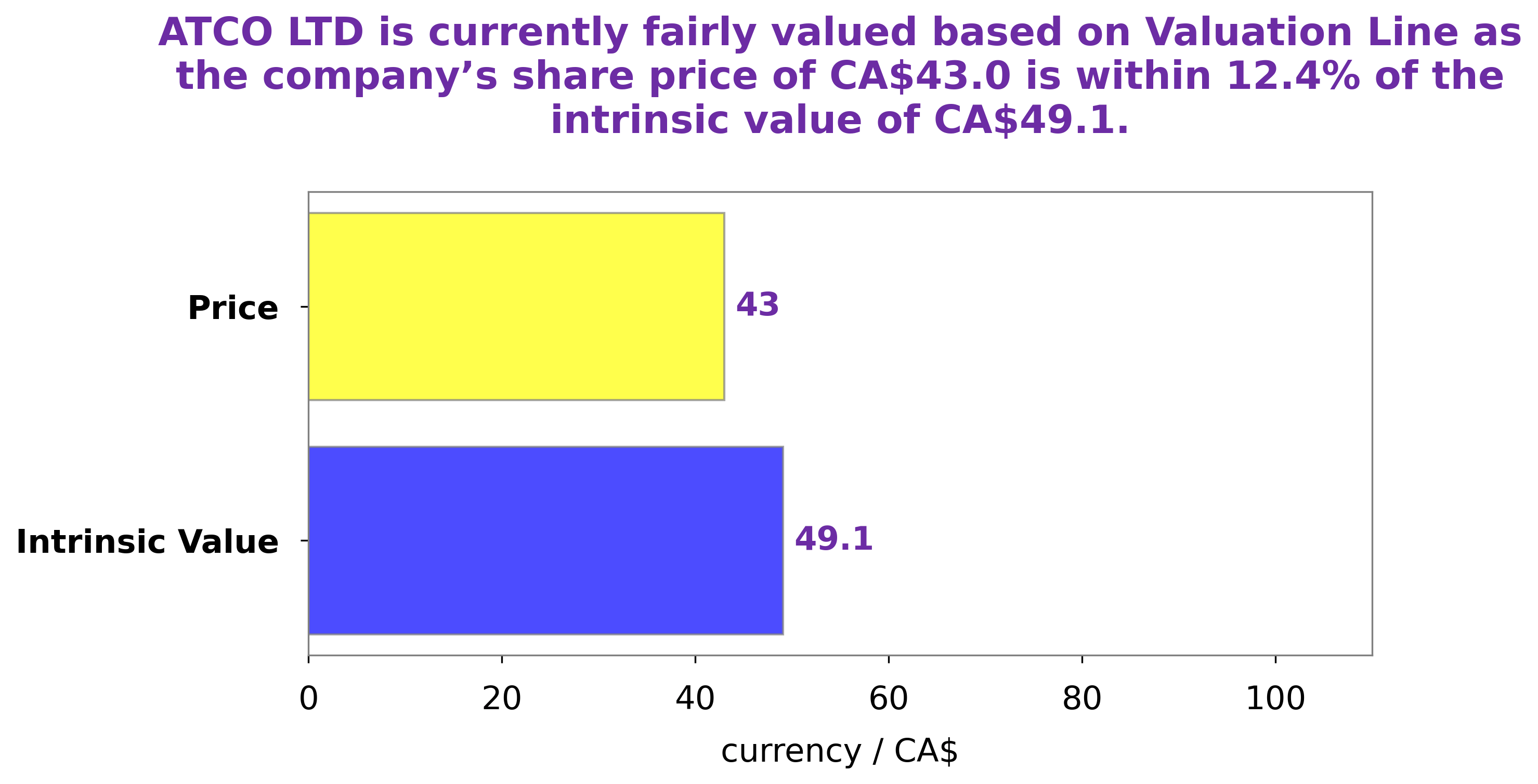 At GoodWhale, we recently conducted an analysis of ATCO LTD‘s wellbeing. According to our proprietary Valuation Line, the intrinsic value of ATCO LTD share is around CA$49.1. Currently, ATCO LTD stock is traded at CA$43.0, a fair price which is undervalued by 12.5%. This makes it a great investment opportunity for those looking to benefit from a potential upside in the future. More…