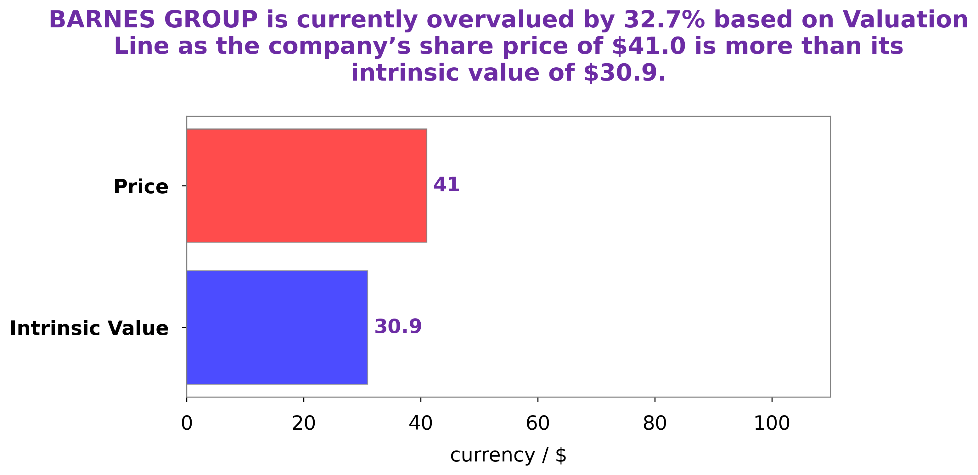 At GoodWhale, we have conducted an analysis of BARNES GROUP‘s financials, and calculated the fair value of their stock to be around $30.9. We arrived at this figure using our proprietary Valuation Line, which takes into account the company’s fundamentals and current market conditions. However, BARNES GROUP’s share is currently trading at $41.0, overvalued by 32.9%. This indicates that there is potential for profit, but also that investors should be cautious and be sure to keep an eye on the stock before making a decision. More…
