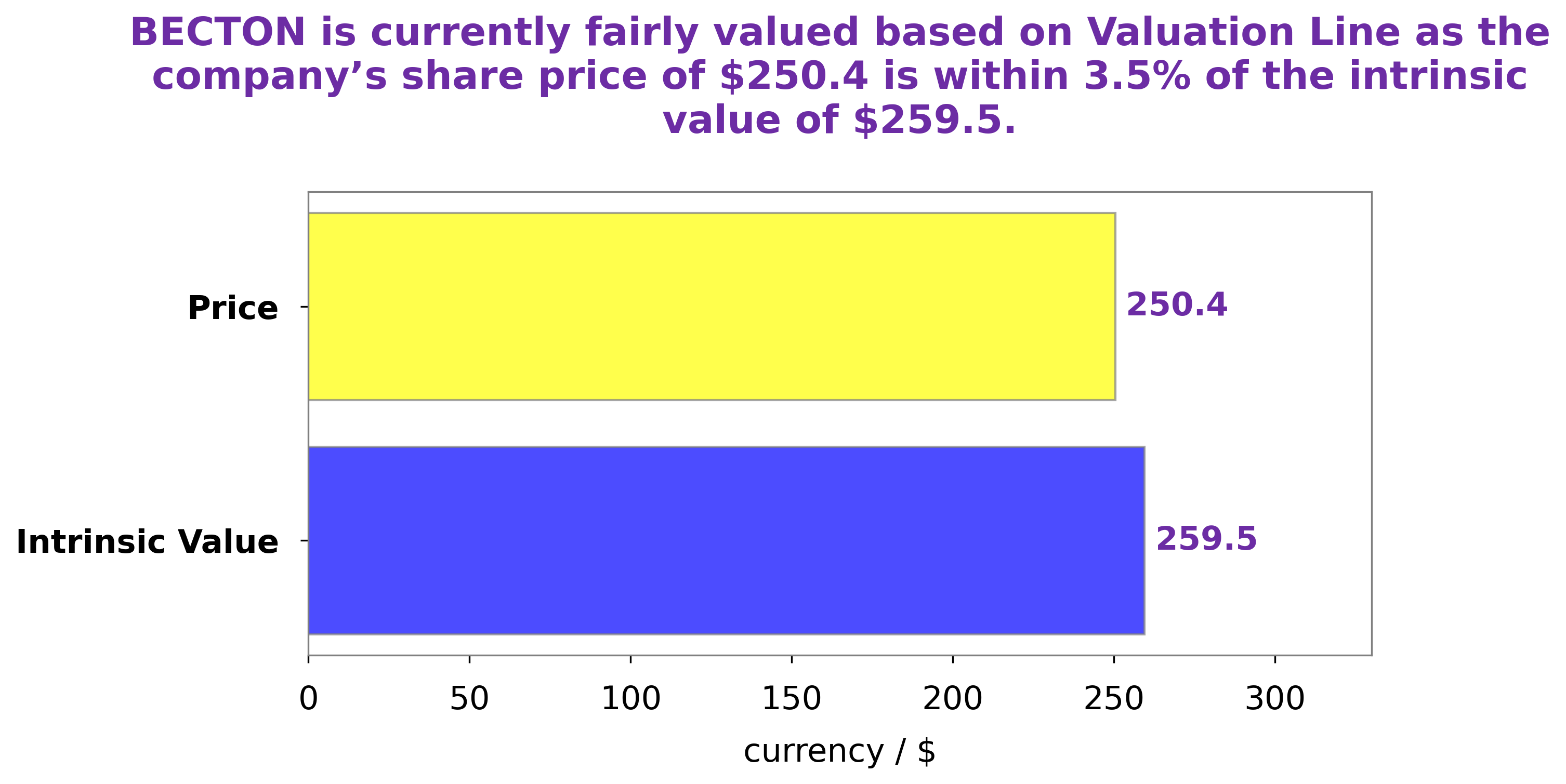 At GoodWhale, we recently conducted an analysis of BECTON‘s wellbeing. Our proprietary Valuation Line determined that the intrinsic value of BECTON share is around $259.5. Presently, BECTON stock is traded at $250.4, which appears to be a fair price that is undervalued by 3.5%. Our analysis indicates that investors may stand to benefit from investing in BECTON at this pricing. More…