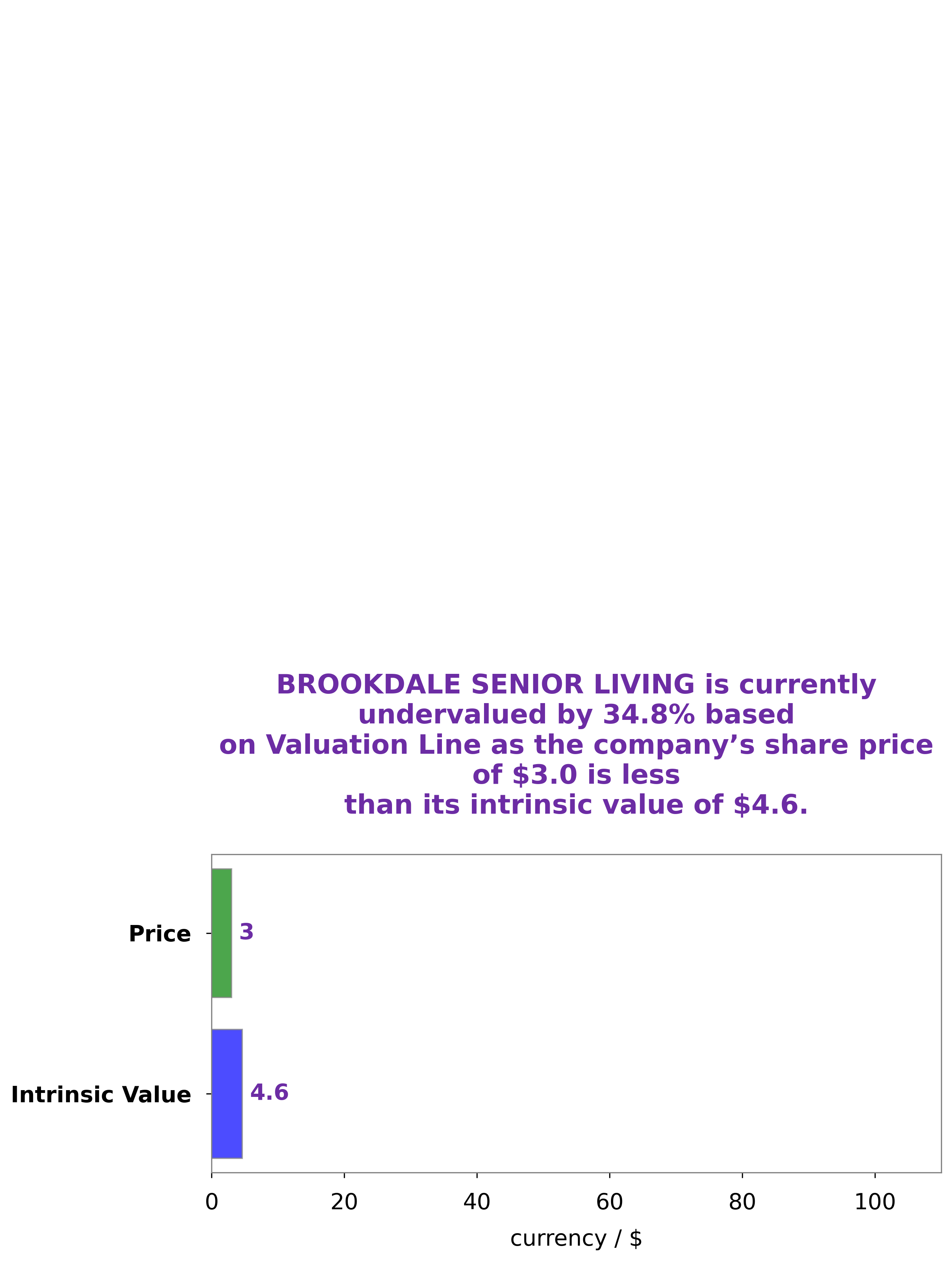 At GoodWhale, we have analyzed the financials of BROOKDALE SENIOR LIVING and found that the intrinsic value of its share is around $4.6. This value has been calculated by our proprietary Valuation Line which takes into consideration the fundamentals and financial performance of the company. Currently, BROOKDALE SENIOR LIVING stock is traded at $3.0 and is undervalued by 35.2%. This presents an attractive opportunity for investors to make a considerable return on their investments. More…