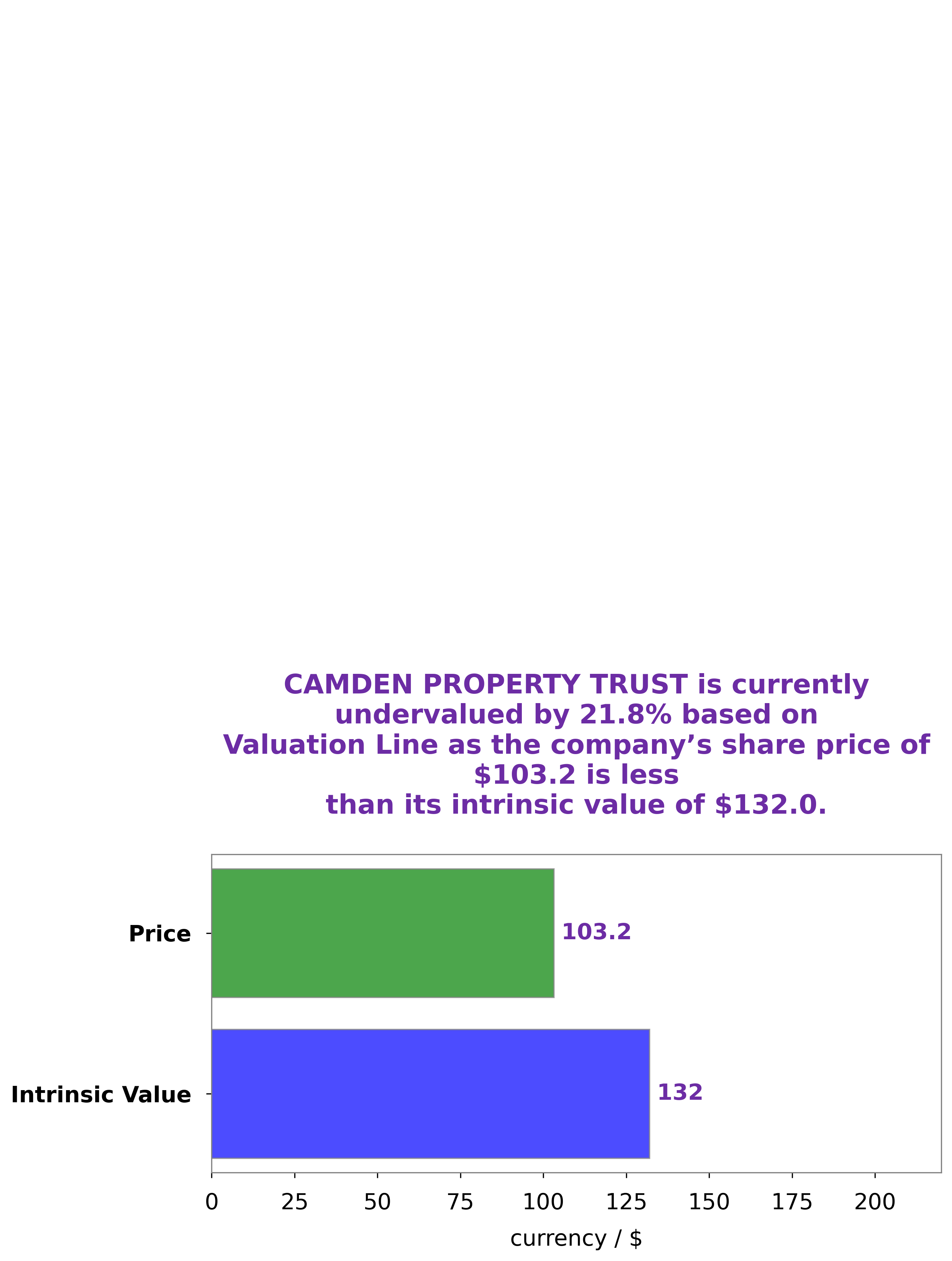 At GoodWhale, we have analyzed CAMDEN PROPERTY TRUST’s wellbeing, and have come to the conclusion that its intrinsic value is around $132.0. This figure is determined by our proprietary Valuation Line. Currently, CAMDEN PROPERTY TRUST stock is traded at $103.2, making it undervalued by 21.8%. We have assessed the company’s performance and determined that it is a good investment opportunity. More…