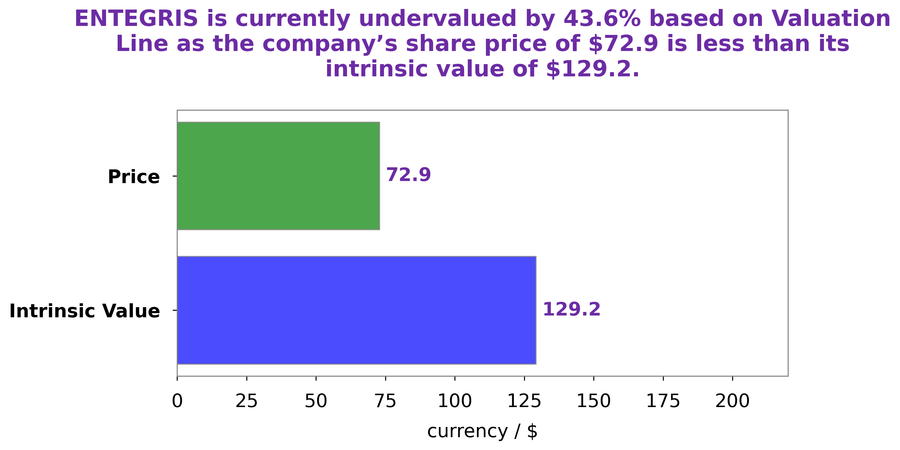 At GoodWhale, we have conducted an analysis of ENTEGRIS‘s wellbeing and have come to an intrinsic value of around $129.2, determined by our proprietary Valuation Line. This figure demonstrates that the current market price of ENTEGRIS stock, which is currently trading at $72.9, is severely undervalued by 43.6%. This presents a compelling opportunity for investors who are looking for a company that has high potential for growth and value creation. In order for investors to take full advantage of this undervalued opportunity, they must act quickly in order to capture it before the market corrects itself. More…