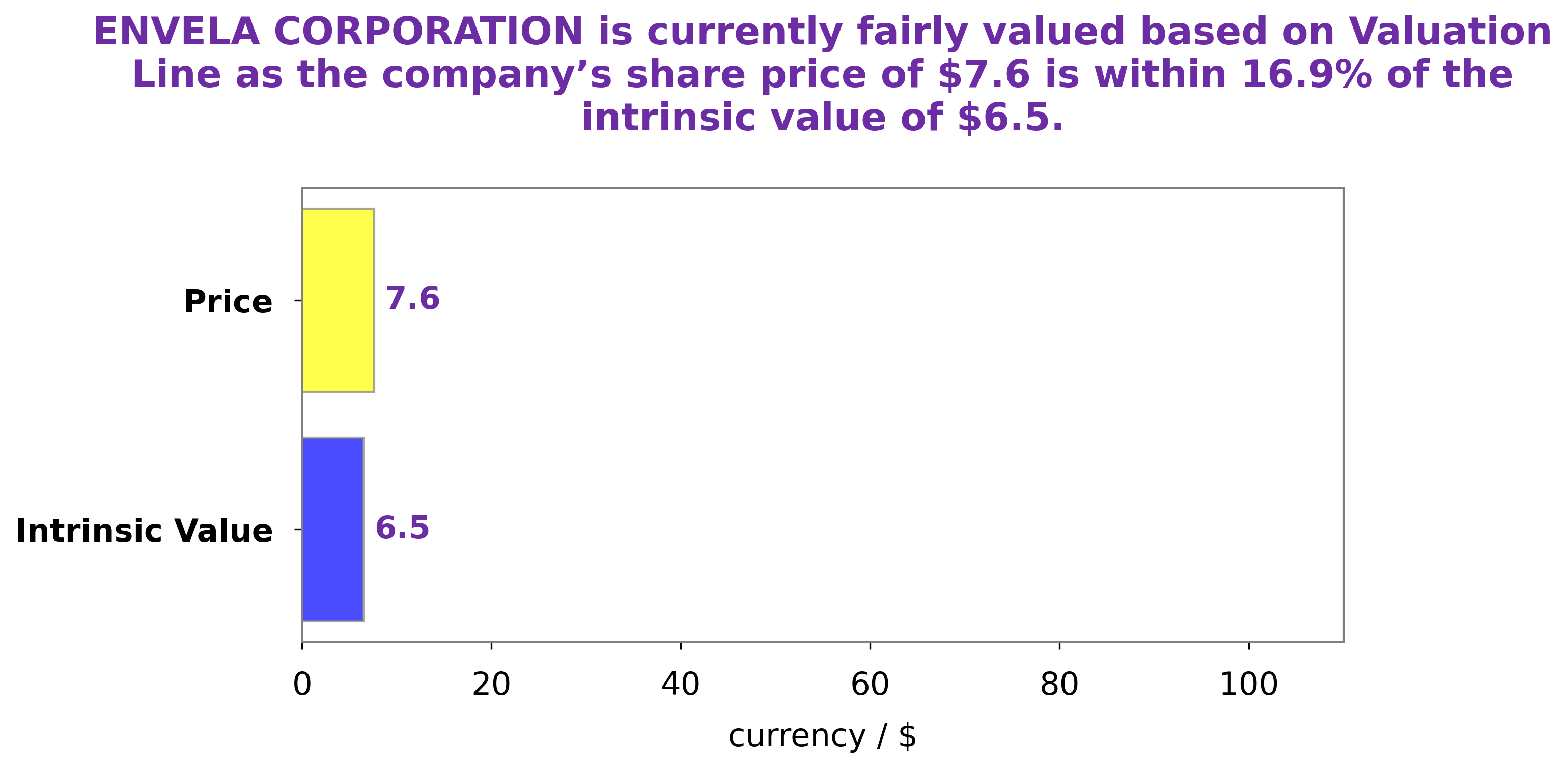 At GoodWhale, we’ve analyzed the financials of ENVELA CORPORATION and used our proprietary Valuation Line to calculate the intrinsic value of ENVELA CORPORATION’s share. We’ve established that the intrinsic value is close to $6.5. Currently, the stock is traded at $7.6, which is overvalued by 17.1%. In other words, the fair price of the stock should be around the $6.5 figure. More…
