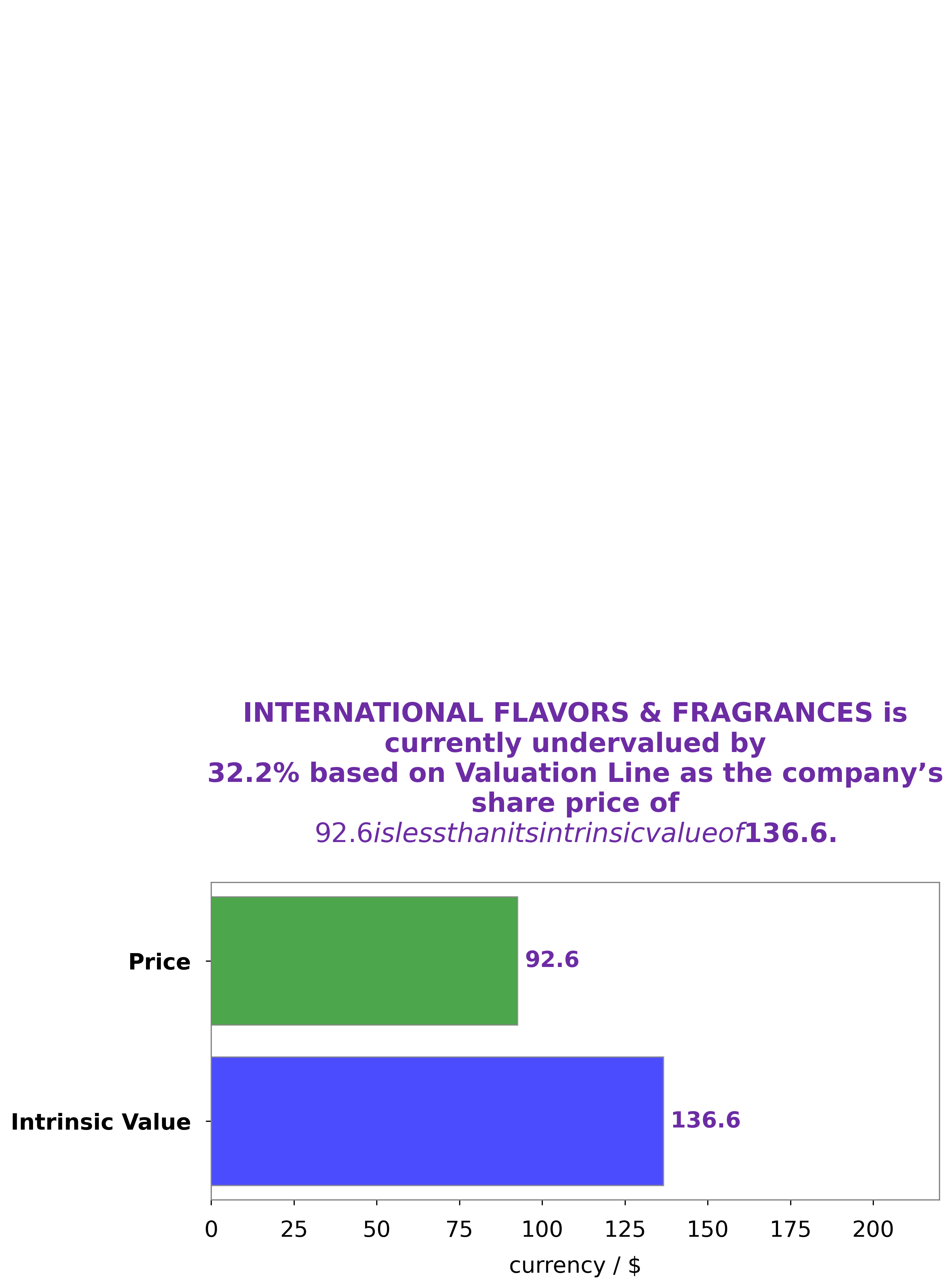 As GoodWhale, we have analyzed INTERNATIONAL FLAVORS & FRAGRANCES’s financials and determined that the intrinsic value of its share is around $136.6. This calculation was determined by our proprietary Valuation Line. As of now, INTERNATIONAL FLAVORS & FRAGRANCES stock is traded at $92.6, which means that it is undervalued by 32.2%. This could make it a good buying opportunity for investors. More…