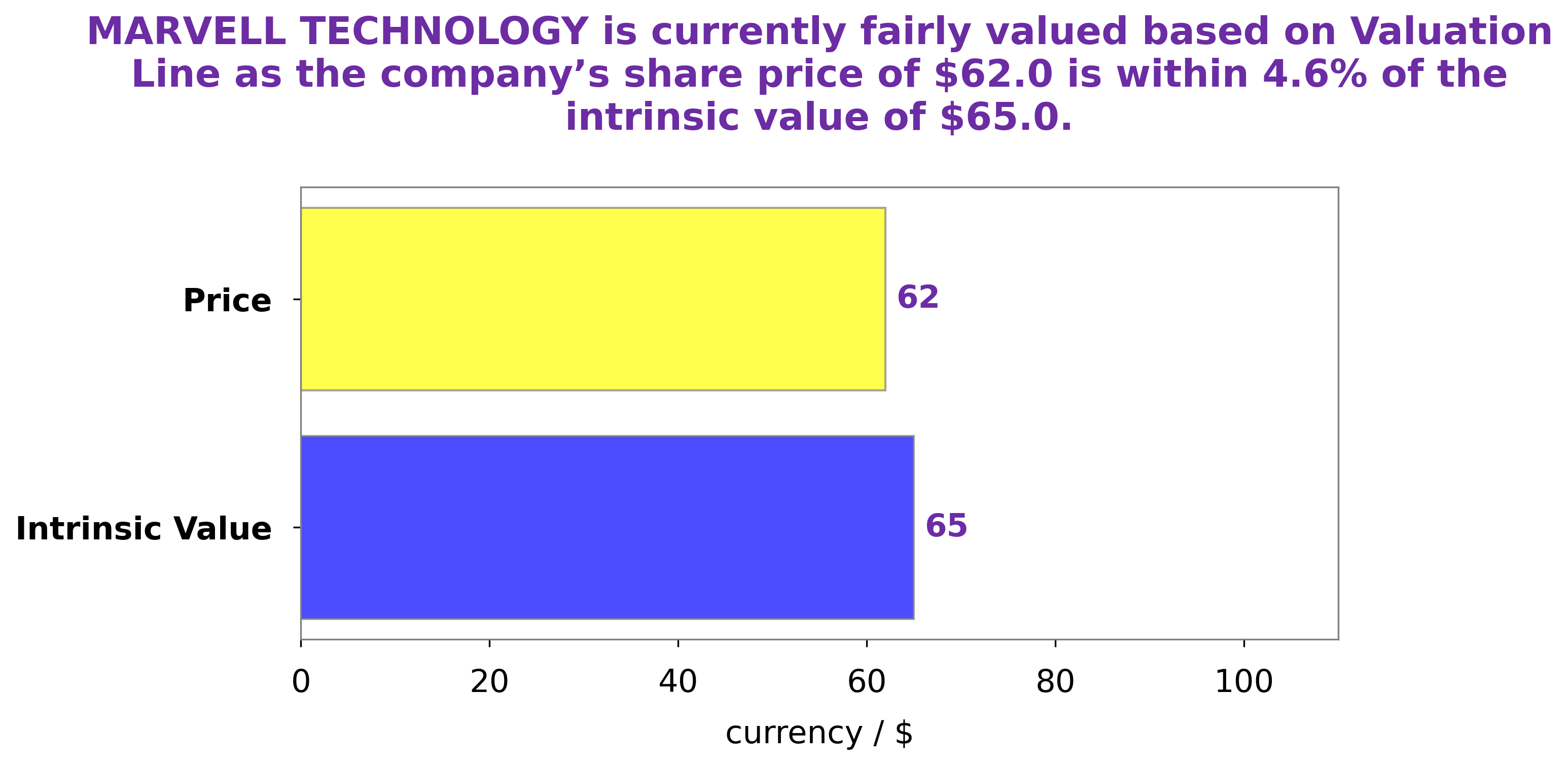 At GoodWhale, we have conducted an in-depth analysis of MARVELL TECHNOLOGY‘s financials. After taking into account the company’s current and expected performance, we have calculated that the fair value of MARVELL TECHNOLOGY share is around $65.0. To arrive at this number, we used our proprietary Valuation Line which combines intrinsic and relative valuations. From this, we can conclude that MARVELL TECHNOLOGY stock is currently undervalued, with a price of $62.0, representing a 4.6% discount to the fair value. More…