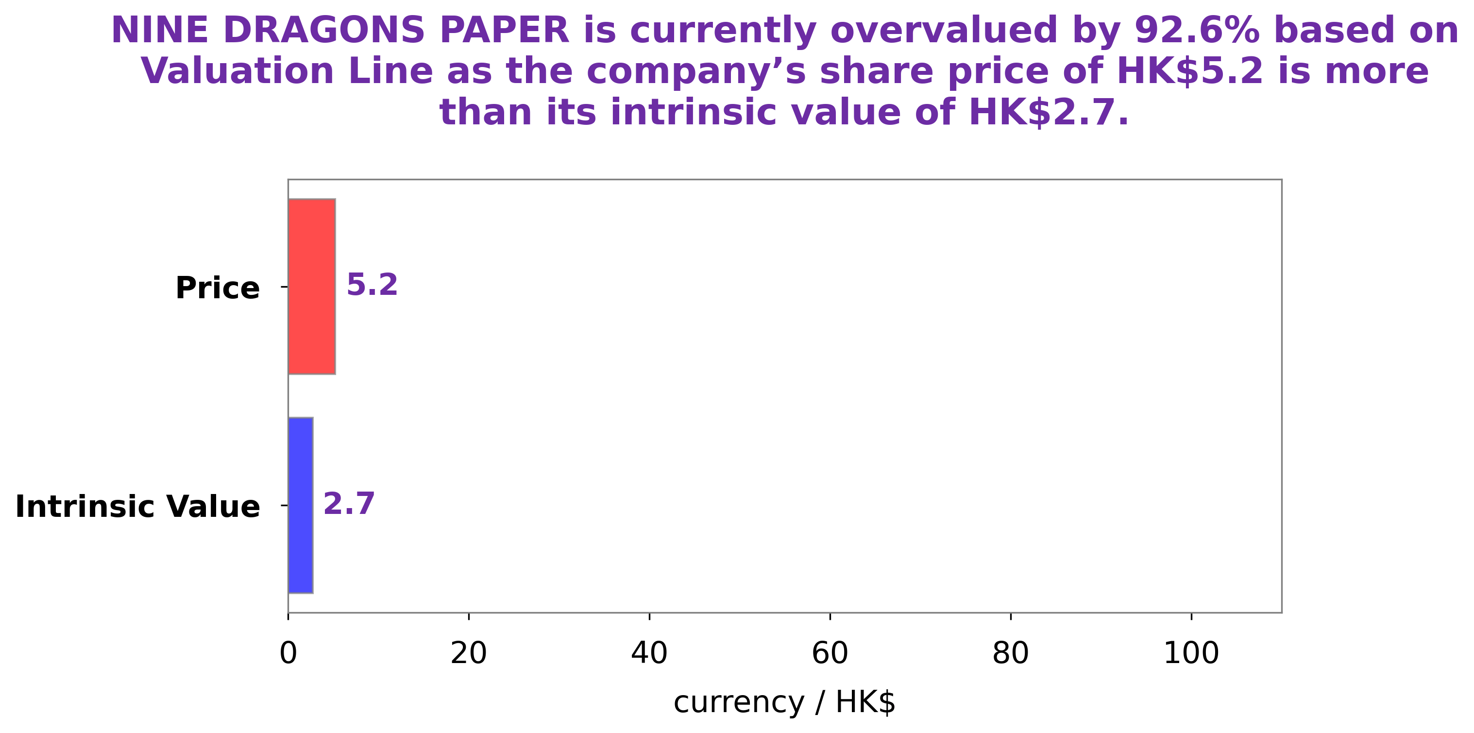 At GoodWhale, we have examined the financials of NINE DRAGONS PAPER and analyzed the data provided. Through our proprietary Valuation Line, we have determined that the fair value of NINE DRAGONS PAPER share is around HK$2.7. However, the current market price of NINE DRAGONS PAPER stock is HK$5.2 which is overvalued by 95.6%. Our analysis suggests that this could be an opportune time to buy into NINE DRAGONS PAPER. More…