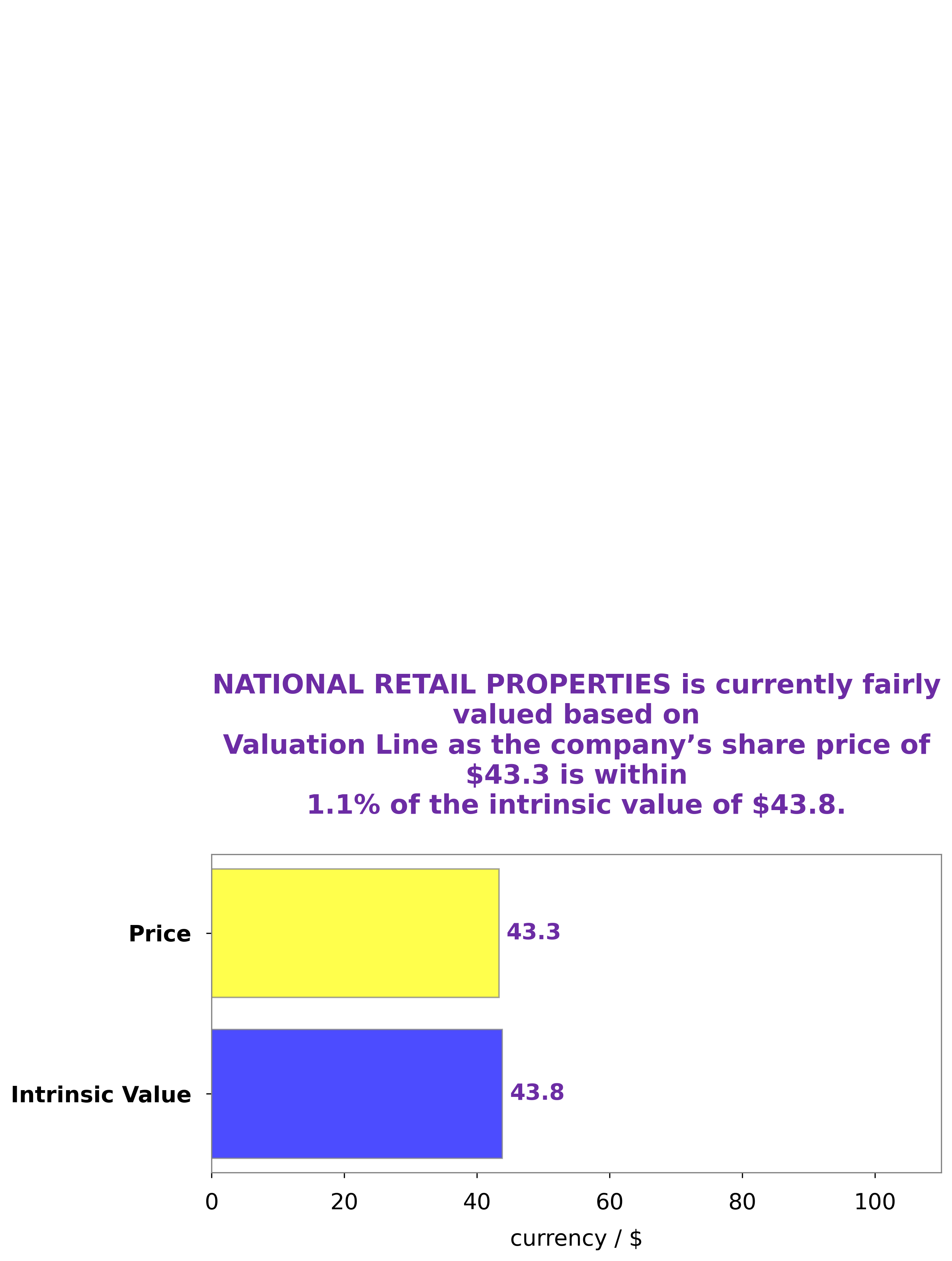 At GoodWhale, we recently performed an analysis of the wellbeing of NATIONAL RETAIL PROPERTIES. After careful assessment, our proprietary Valuation Line determined the intrinsic value of NATIONAL RETAIL PROPERTIES share to be around $43.8. We have found that currently, NATIONAL RETAIL PROPERTIES stock is being traded at a fair price of $43.3, which is slightly undervalued by 1.2%. This means that now is a good time to invest in this company, as long as you are confident with the performance of the stock in the future. More…
