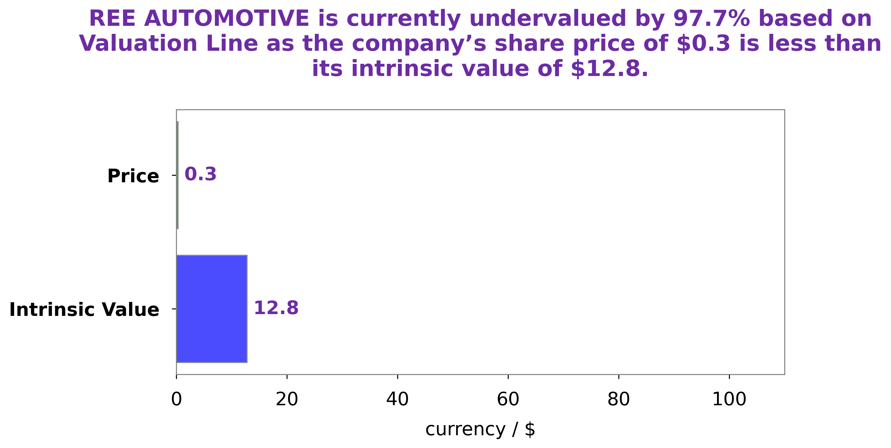 GoodWhale has conducted an analysis of REE AUTOMOTIVE‘s fundamentals and found an intrinsic value of its share to be around $12.8, as calculated by our proprietary Valuation Line. This value is significantly higher than the trading price of REE AUTOMOTIVE stock at the moment. At $0.3, the stock is currently undervalued by 97.7%. We believe that this represents a great buying opportunity for investors who are able to research and evaluate the intrinsic value of a company’s shares. More…