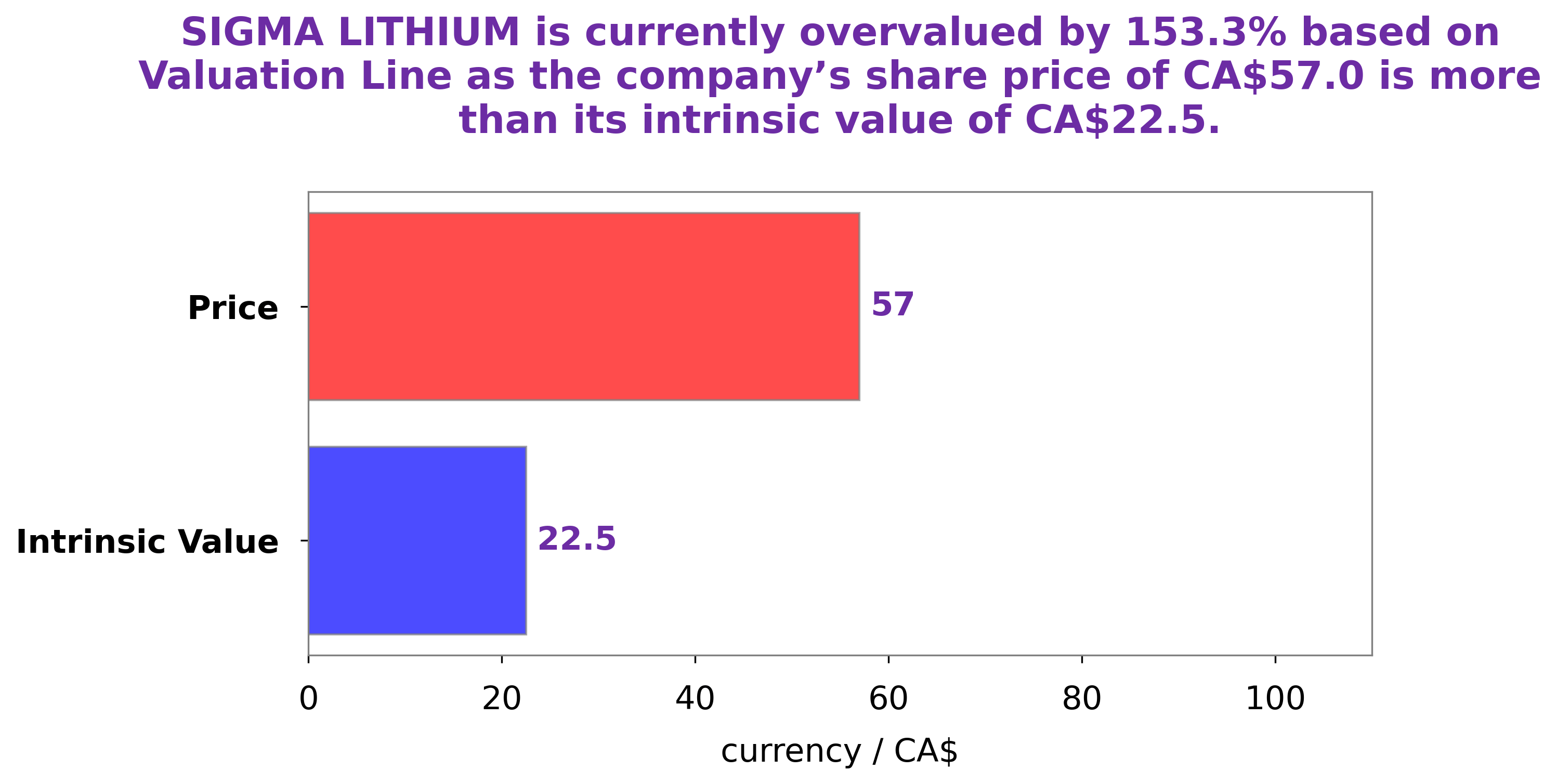 GoodWhale has conducted an in-depth analysis of SIGMA LITHIUM‘s wellbeing and have calculated the company’s intrinsic value to be around CA$22.5. This value was determined through our proprietary Valuation Line, which takes into consideration multiple factors such as the company’s financials, competitive landscape, and industry trends. At this time, SIGMA LITHIUM stock is being traded at CA$57.0, representing an overvaluation of 153.4%. Going forward, investors should be aware of this discrepancy and consider their investments carefully. More…