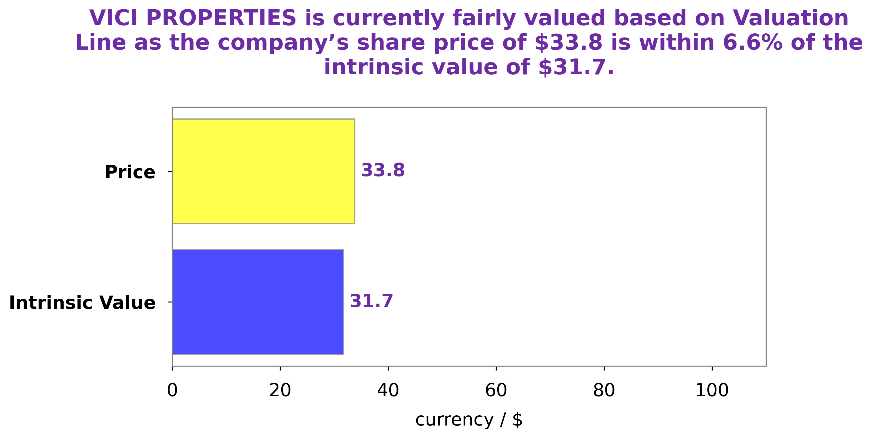 At GoodWhale, we have conducted a comprehensive analysis of VICI PROPERTIES‘ fundamentals. Our proprietary Valuation Line suggests that the fair value of VICI PROPERTIES share is around $31.7. Currently, VICI PROPERTIES stock is traded at $33.8, which means that the stock is slightly overvalued by 6.7%. More…