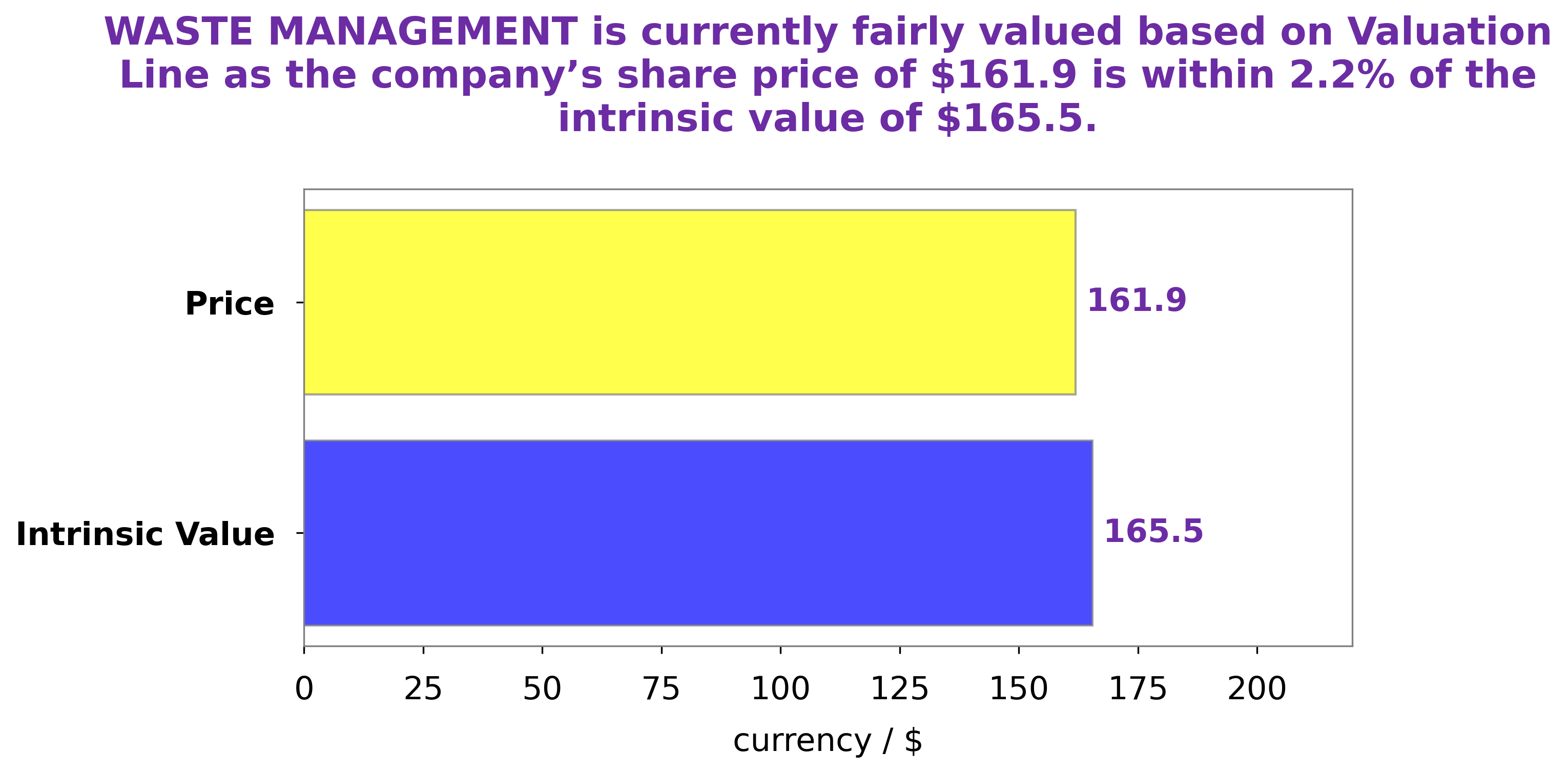 At GoodWhale, our team of experts has conducted a careful analysis of the fundamentals of WASTE MANAGEMENT. Using our proprietary Valuation Line, we have concluded that the fair value of the WASTE MANAGEMENT share is around $165.5. At the time of writing, the stock is being traded at $161.9, which is a fair price that is slightly undervalued by 2.2%. This provides an interesting opportunity to investors looking to buy a quality stock at a discount. More…