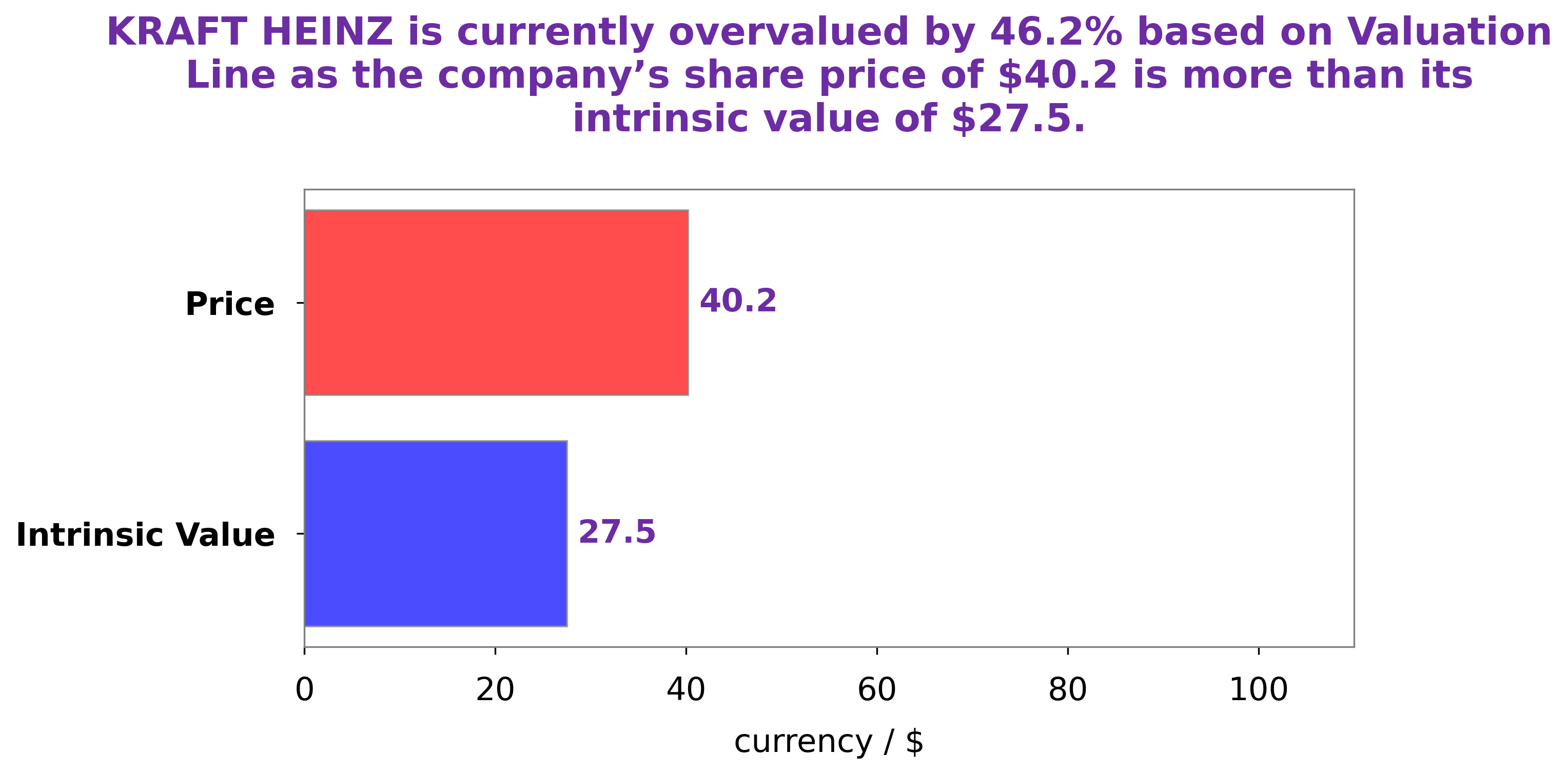 At GoodWhale, we analyze the financials of KRAFT HEINZ to make sure investors have the right information to assess their stock. According to our proprietary Valuation Line, KRAFT HEINZ share is worth $27.5. This intrinsic value indicates that the stock is currently overvalued by 46.4%, as it is currently trading at $40.2 per share. With this in mind, investors should be cautious when it comes to investing in KRAFT HEINZ at its current price. More…