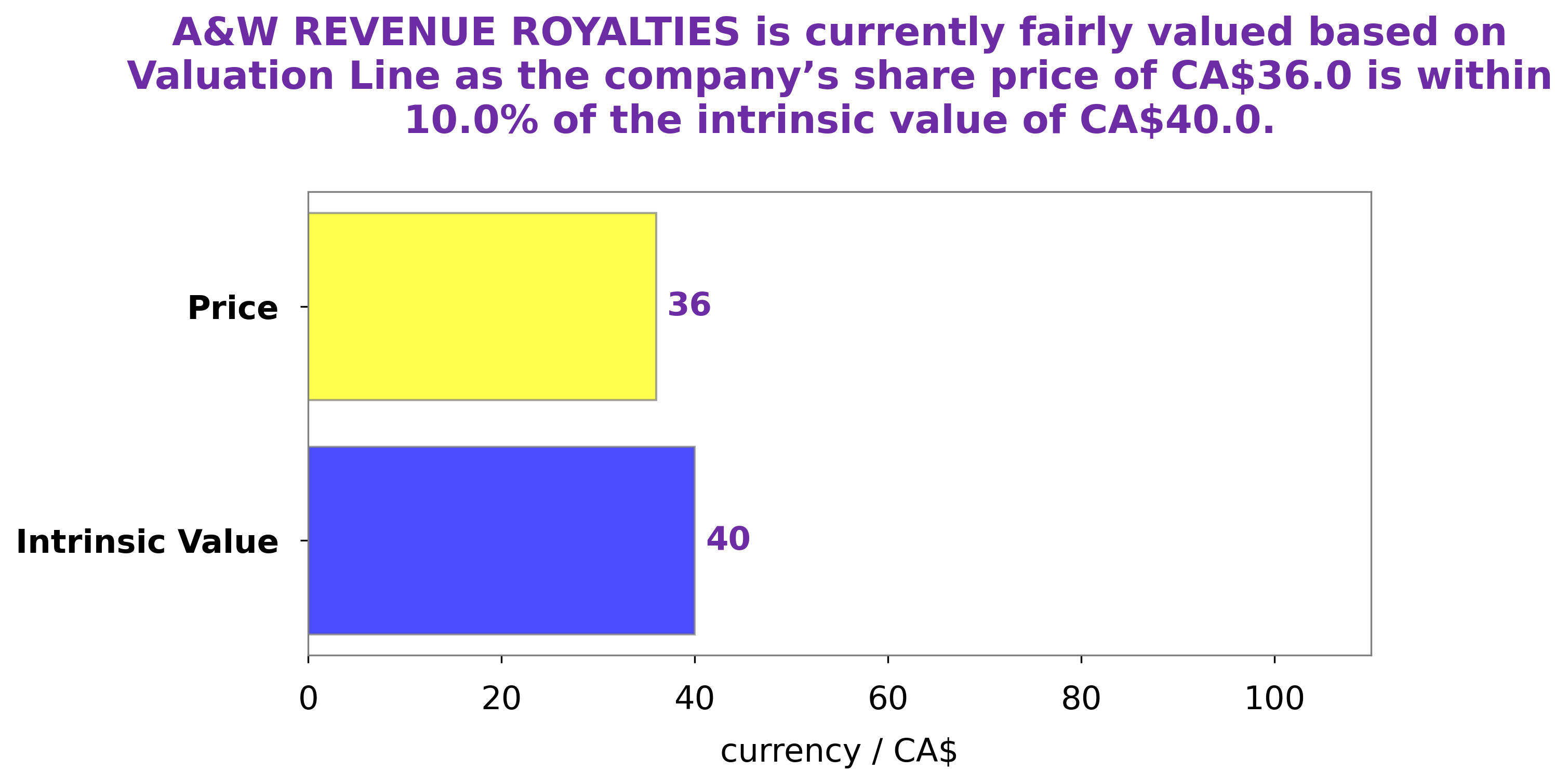 GoodWhale’s financial analysis of A&W REVENUE ROYALTIES reveals that its intrinsic value is around CA$40.0. We calculated this by using our proprietary Valuation Line, which takes into account its current assets and liabilities as well as projections for future growth. Currently, the stock is trading at CA$36.0, representing a 10.0% discount to its intrinsic value. This means that A&W REVENUE ROYALTIES is currently undervalued. More…