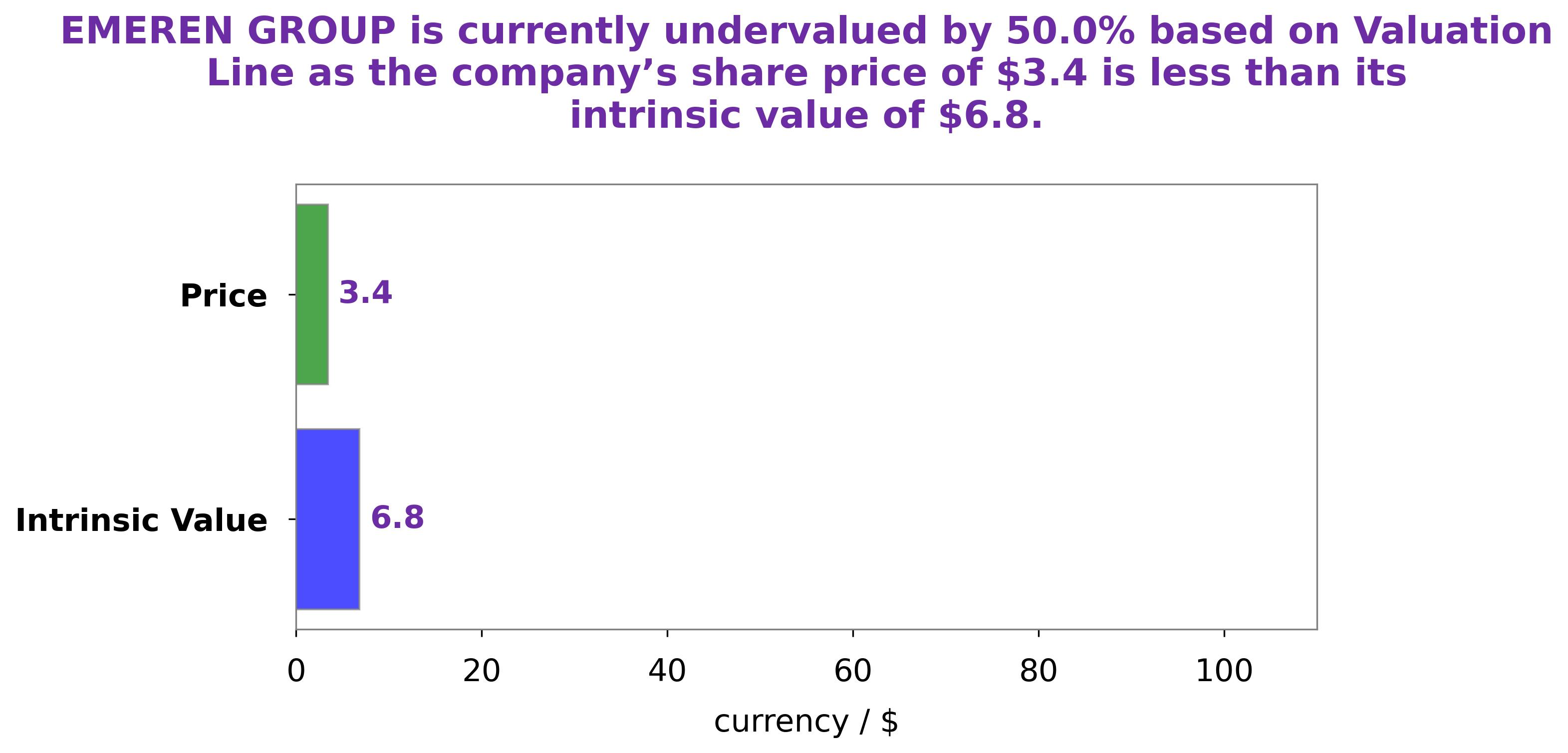 At GoodWhale, we recently completed an analysis of EMEREN GROUP‘s financials. Using our proprietary Valuation Line, we calculated the intrinsic value of an EMEREN GROUP share to be approximately $6.8. Currently, EMEREN GROUP stock is trading at $3.4, representing a 50.3% discount to its true value. We believe this presents a great opportunity for investors and suggest a buy rating for this stock. More…