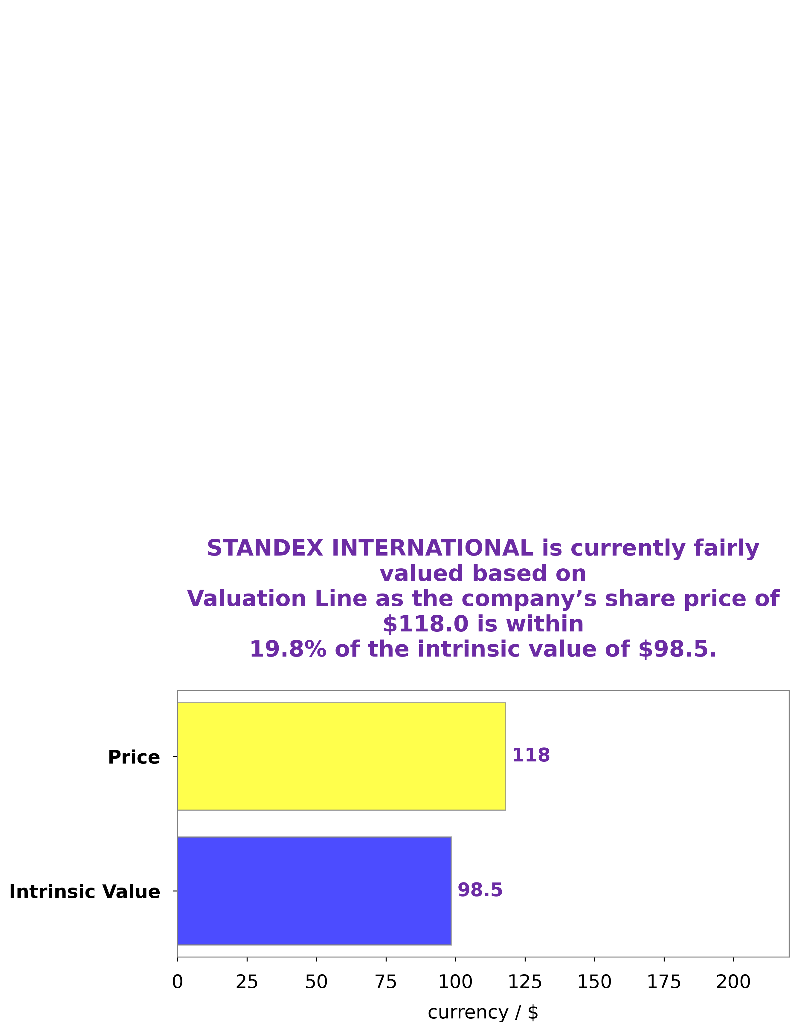 We at GoodWhale have conducted an analysis of STANDEX INTERNATIONAL‘s fundamentals and have determined a fair value of its stock to be $98.5, as calculated by our proprietary Valuation Line. Currently, STANDEX INTERNATIONAL stock is being traded at $118.0, which represents a fair price of being overvalued by 19.9%. This implies that the stock may not be the most efficient investment option at this point in time. More…