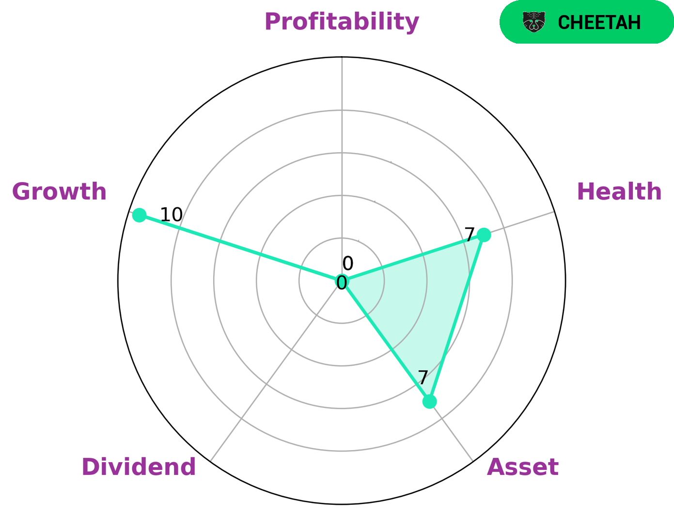 Investors looking for high growth potential may be interested in NAAS TECHNOLOGY, as indicated by its classification as a ‘cheetah’ in the VI Star Chart. A cheetah is a type of company that has achieved high revenue or earnings growth, but is considered less stable due to lower profitability. Despite its less than stellar profitability, the company has a strong health score of 7/10, signifying its ability to withstand any economic downturns without the risk of bankruptcy. The company’s assets and growth are considered strong, however its dividend and profitability are weak. It is likely that investors looking for a long-term investment may be more interested in NAAS TECHNOLOGY due to its potential for high growth over time.